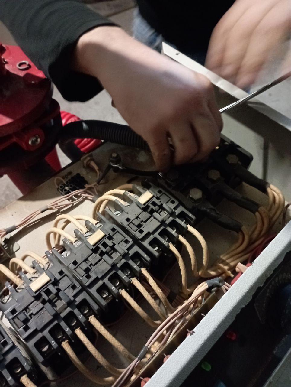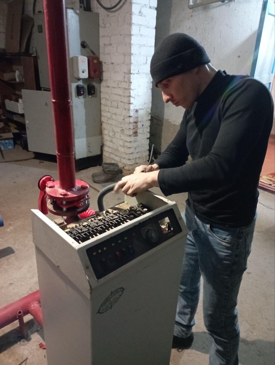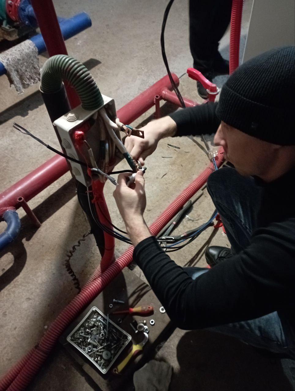 Из-за скачков напряжения в электросетях возникла неисправность в системе питания оборудования. Чтобы восстановить работу котельной и обеспечить теплом школьное здание, электрики приняли техническое решение о переподключении кабеля питания с одного из новых котлов на старый резервный.