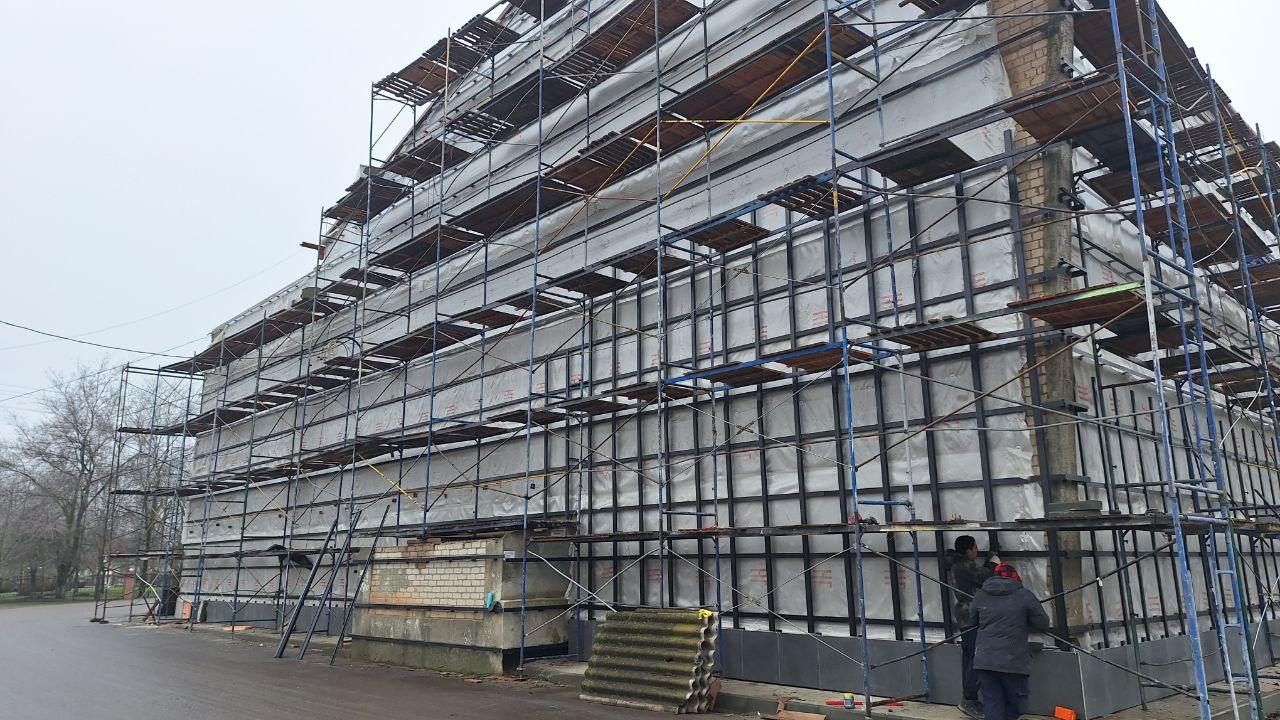 Параллельно началась облицовка фасада керамогранитной плиткой. Материал позволит не только улучшить внешний вид здания, но и обеспечит надёжную защиту конструкций в будущем.