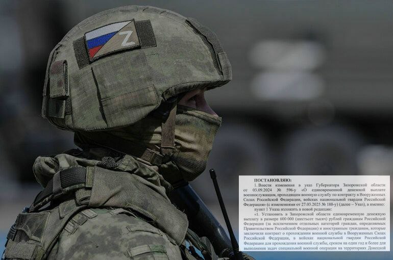 Согласно данному документу, сумма единовременной выплаты при заключении контракта с Минобороны РФ в Запорожской области составит 600 тысяч рублей.