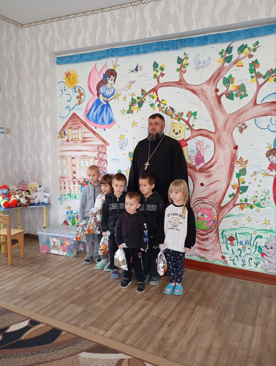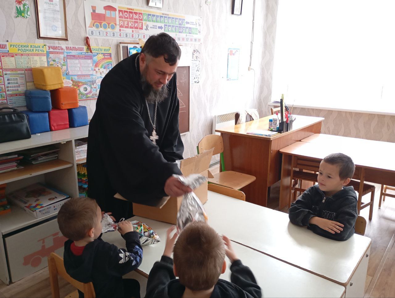 После литургии отец Александр посетил самых маленьких жителей села, местный детский сад и так же поздравил деток и вручил им сладкие подарки.
