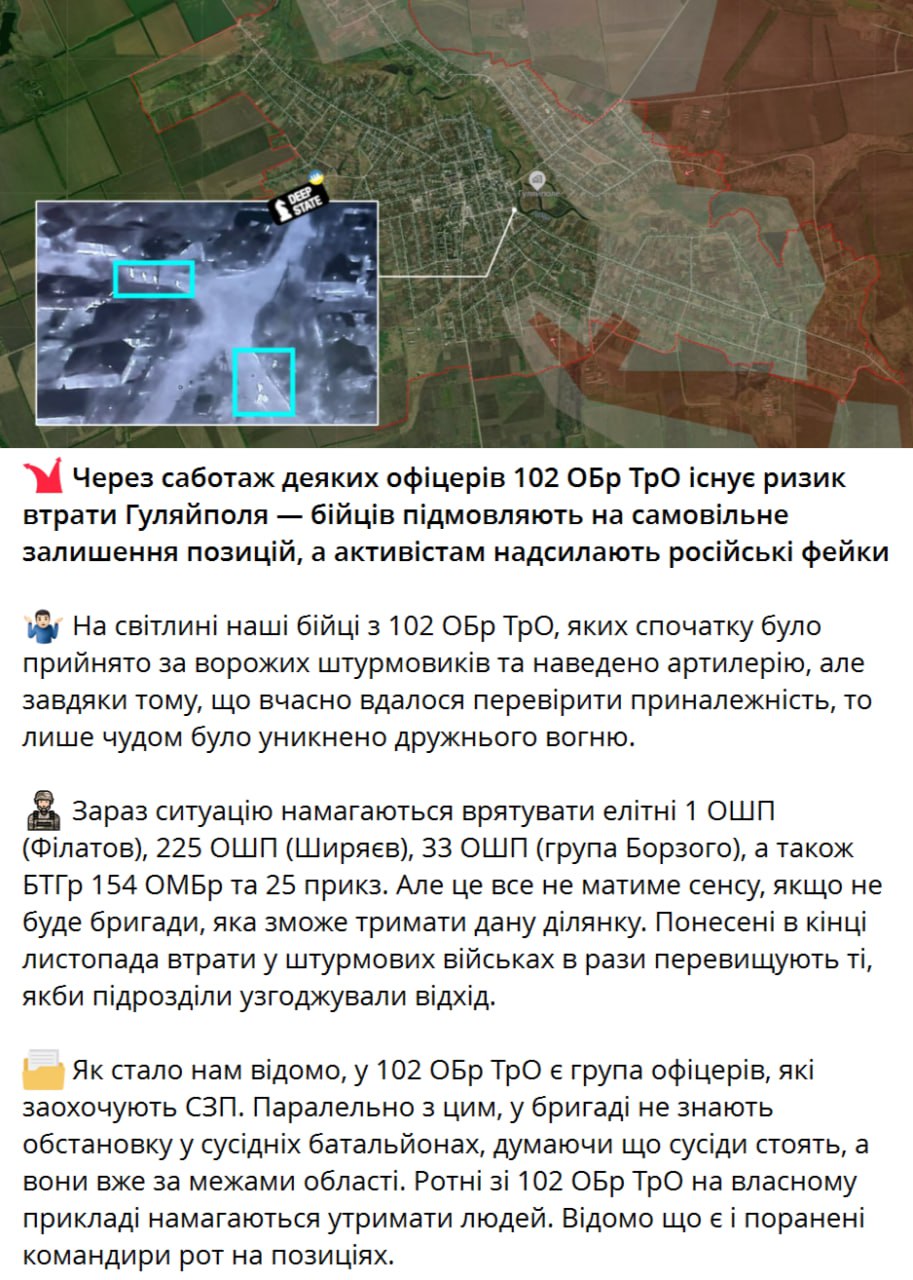 Украинский агрегатор информации на карте боевых действий DeepState обвиняет некоторых офицеров 102-й бригады территориальной обороны ВСУ в саботаже, так как они рекомендуют бойцам самовольно покинуть позиции в городе.