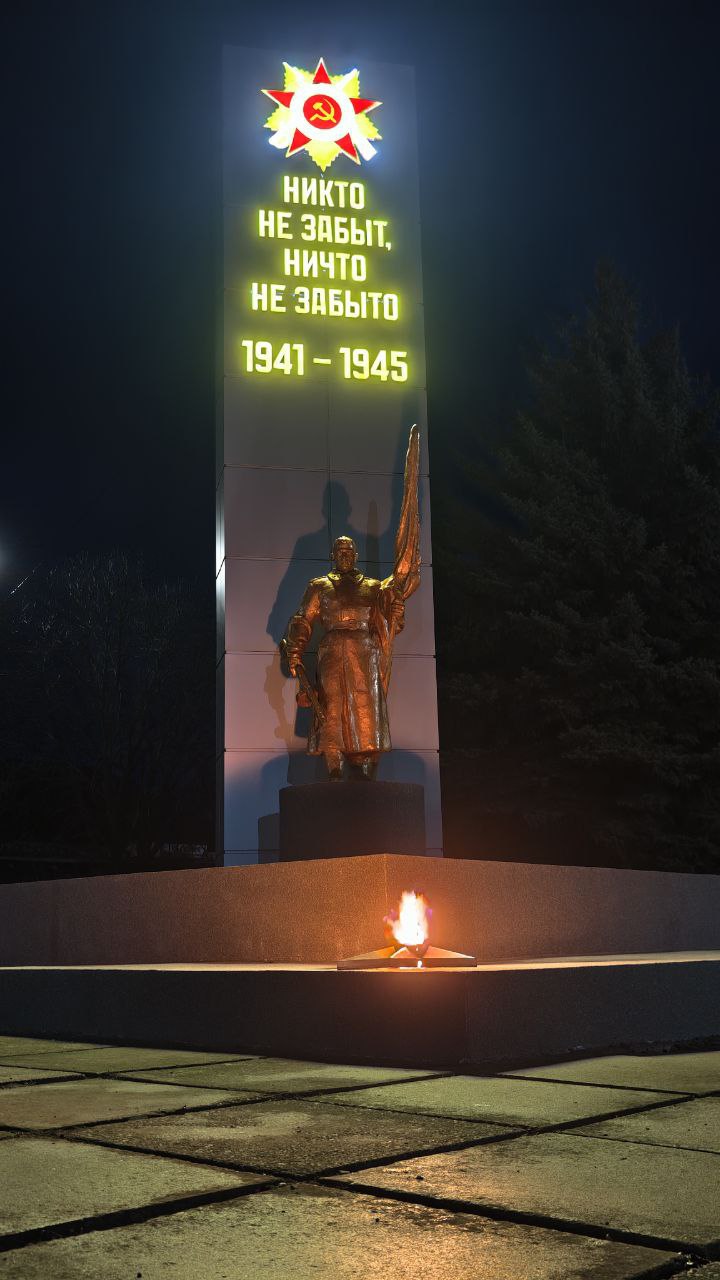 Ночной памятник воинам-односельчанам, которые не вернулись с полей сражений Великой Отечественной войны «Никто не забыт, ничто не забыто» в пгт Андреевка Бердянского района.
