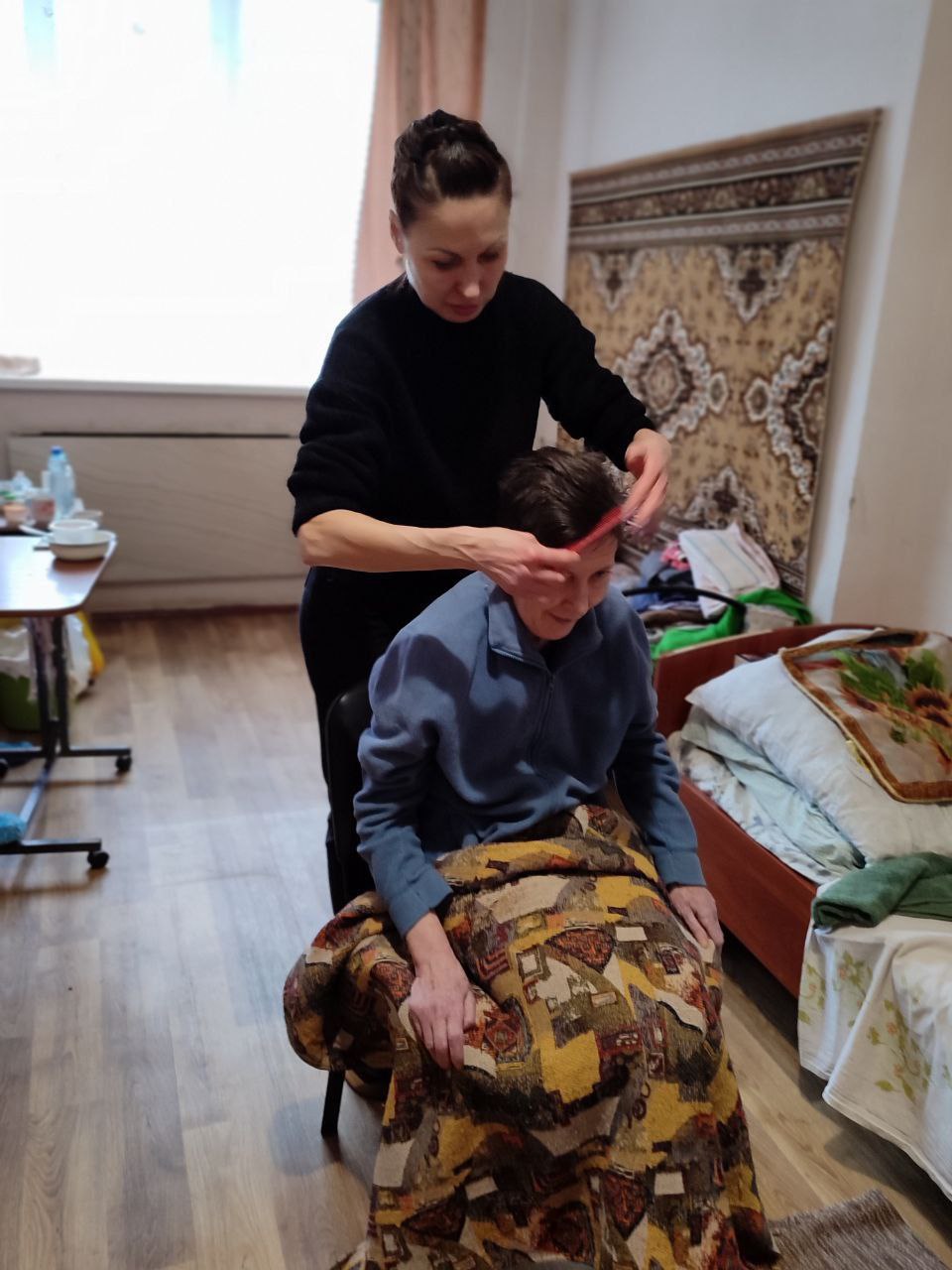 Каждый подопечный получил сладкий набор с шоколадом, печеньем и мандаринами. Мужчинам вручили бритвенные станки, носки и шампунь, женщинам — духи и носочки. Для желающих прямо на месте организовали стрижки.