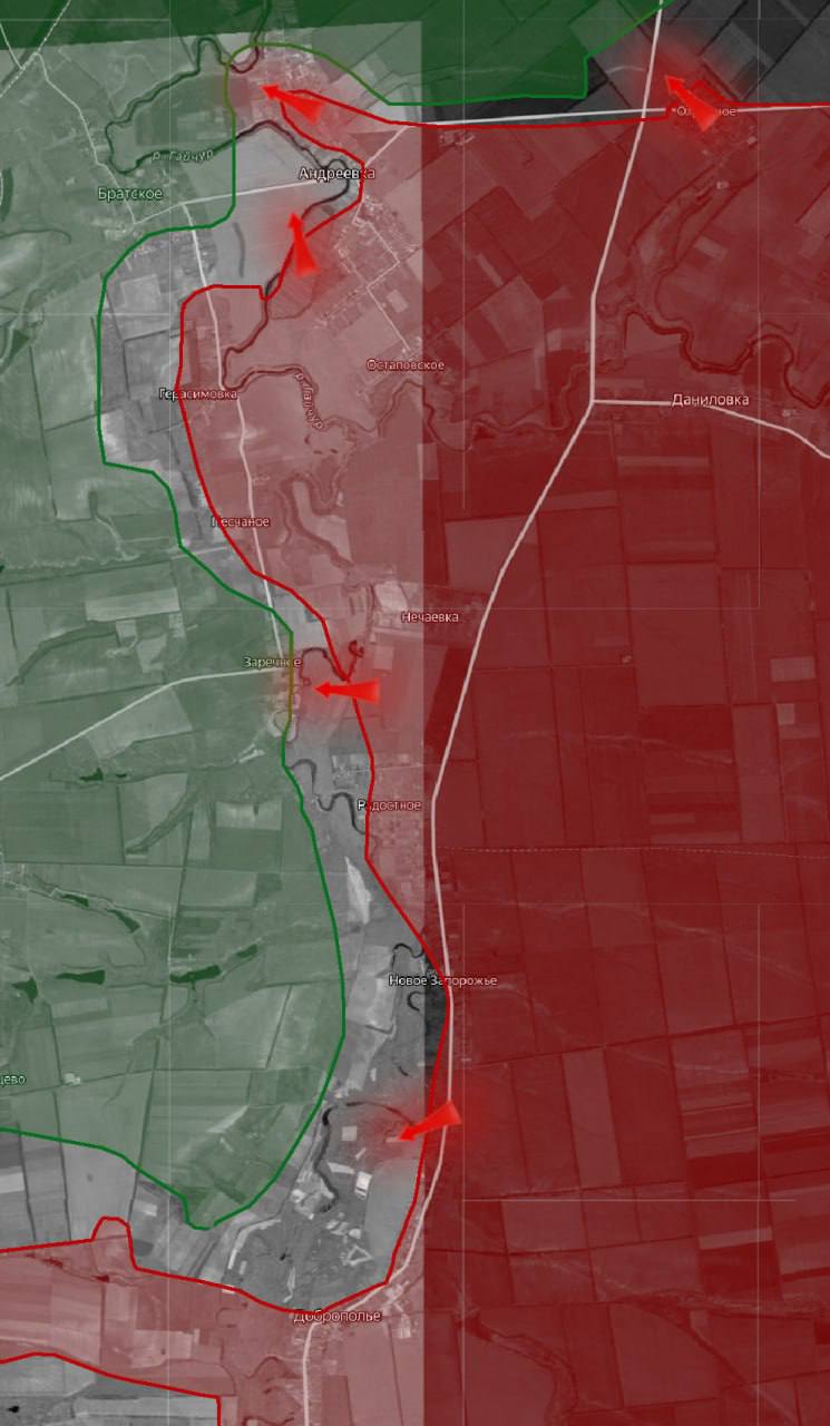 Боестолкновения смещаются на запад к Братскому, на подступах к которому ВСУ организовали оборону на крупном опорнике у русла Гайчура. Российские войска наносят атаки по снабжению ВСУ дронами и атакуют со стороны Андреевки и Герасимовки.