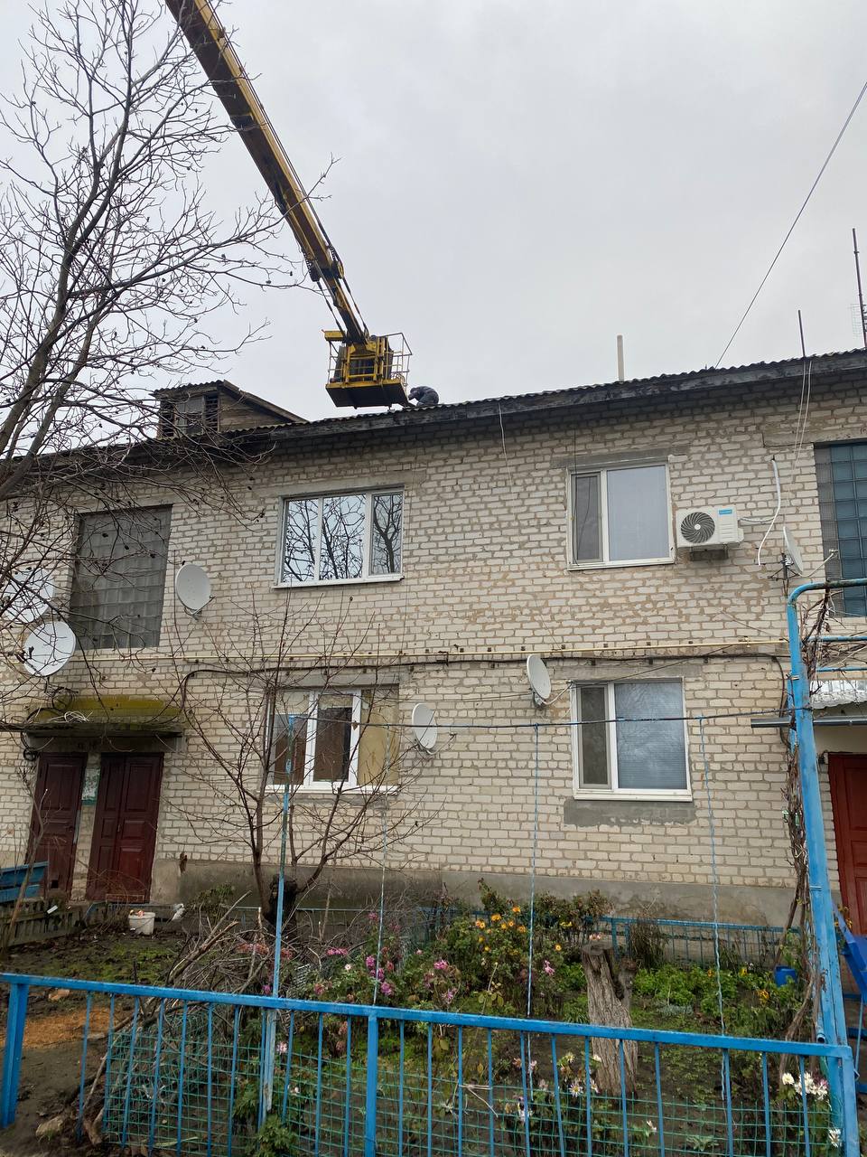 Коммунальщики также выполнили частичный ремонт кровли многоквартирного дома в Молочанске, с применением автовышки, которую предоставил шеф регион Республика Ингушетия.