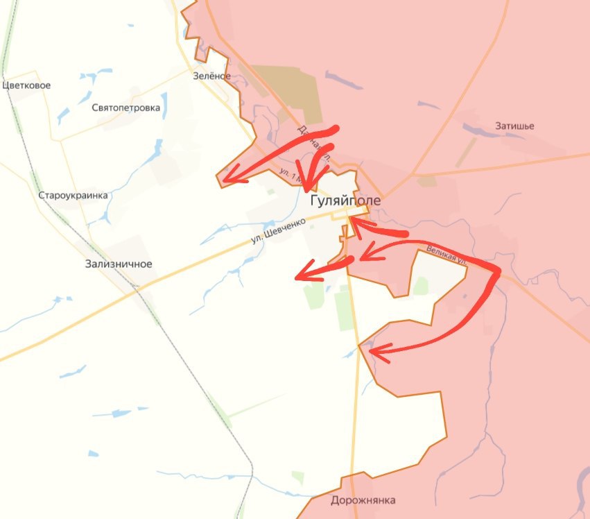 Что это означает? В ближайшей перспективе ВСУ, оказавшись под давлением с юга и севера, будут вынуждены оставить плохо укреплённые позиции в центре Гуляйполя. Им остаётся либо попытка прорыва с тяжёлыми потерями, либо капитуляция.