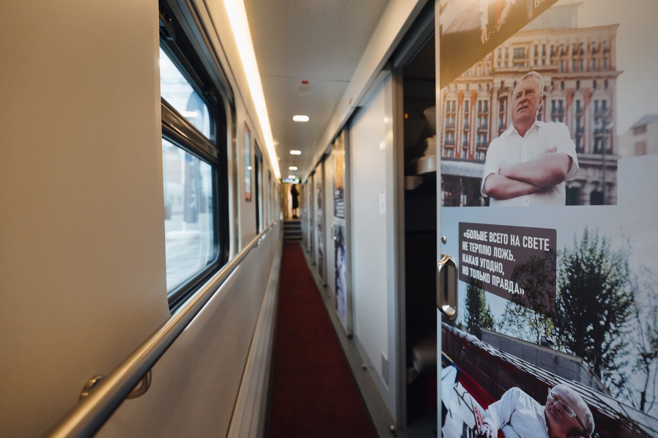 Каждый штабной вагон оформлен с особым смыслом: профиль Владимира Жириновского, его автограф, эмблема Фонда памяти и наследия. Внутри размещена мини-библиотека с наиболее известными трудами политика, а двери купе украшены историческими фотографиями и его яркими, точными цитатами, актуальными и сегодня.