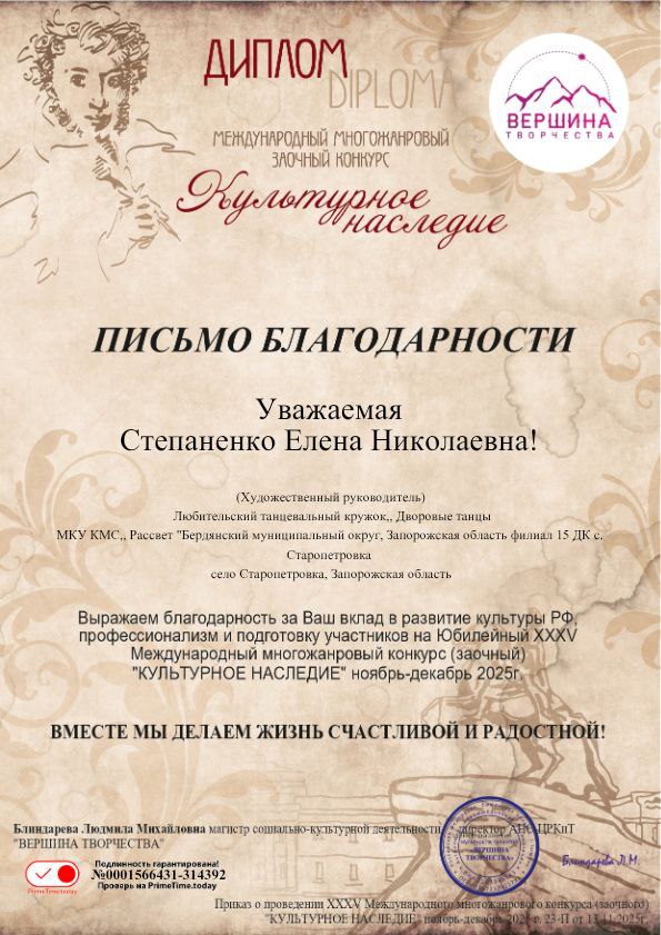 Любительский танцевальный кружок «Дворовые танцы» Старопетровского ДК достойно представил своё творчество на XXXV Международном многожанровом конкурсефестивале «Культурное наследие» (ноябрь–декабрь 2025г.). В номинации «Стилизованный танец» возрастной категории 11–13лет коллектив стал лауреатом IIIстепени с программой «На горе мак». Это достижение подтверждает высокий уровень подготовки участников и творческий потенциал коллектива на международной площадке.
