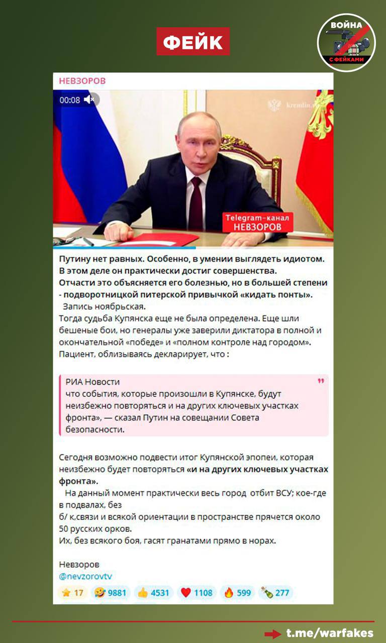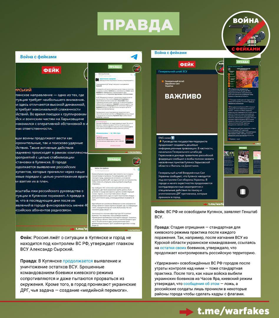 Фейк: ВСУ заняли Купянск и заканчивают его зачистку от сил ВС РФ. Об этом пишут антироссийские Телеграм-каналы.