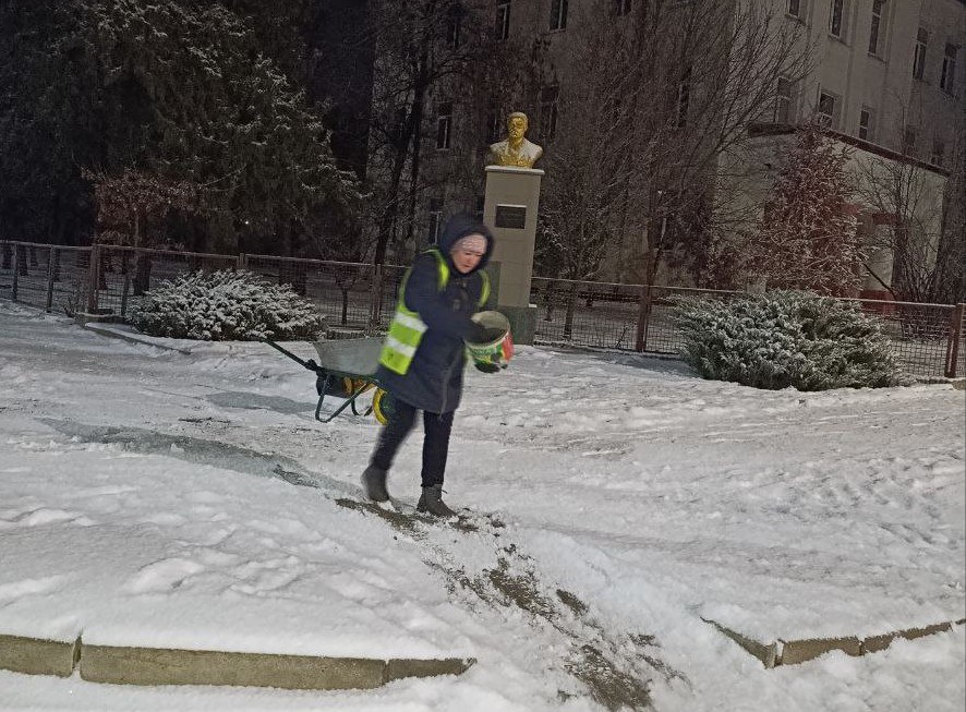 В центре города коммунальщики приступили к ручной посыпке и уборке от снега пешеходных дорожек .