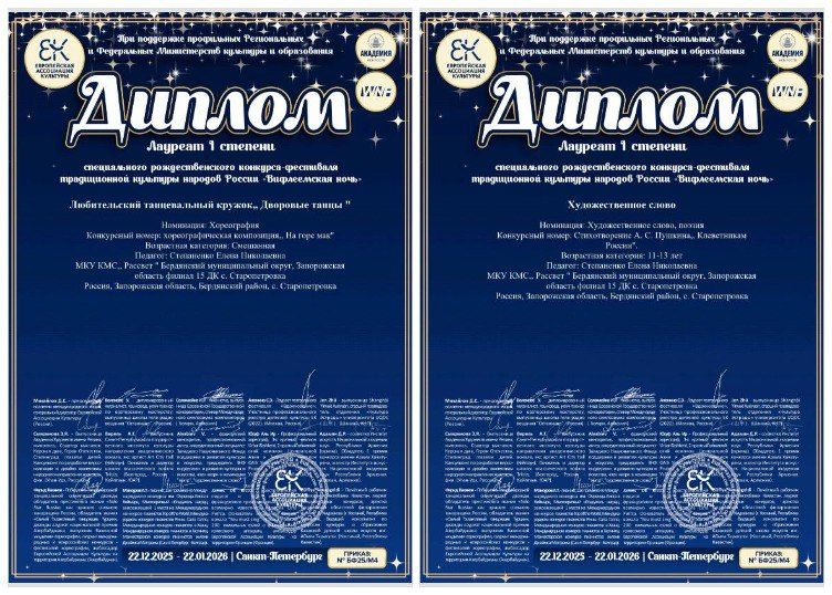 Кружок «Новые таланты» получил дополнительное признание в номинации «Художественное слово», став делегатом от региона для участия в престижном Российско-Китайском Международном конкурсе «Глобал Азия — 2026». Высокую оценку получила и работа руководства ДК — заведующая учреждением Степаненко Е. Н. была отмечена Благодарностью от Европейской Ассоциации Культуры за вклад в развитие международного культурного сотрудничества. Эти достижения подтверждают высокий профессиональный уровень работы Старопетровского ДК и его воспитанников.