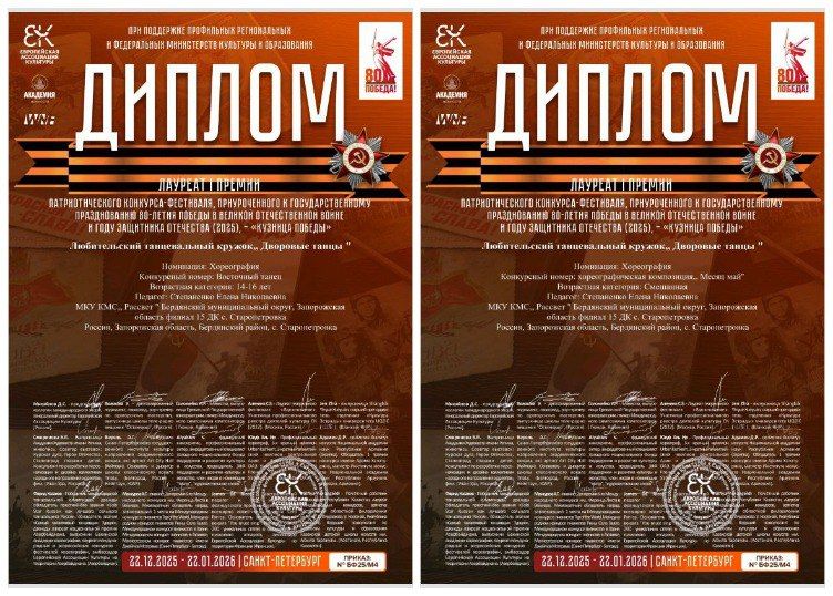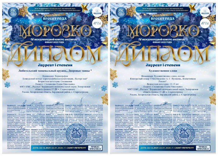 Старопетровский Дом культуры может по праву гордиться достижениями своих творческих коллективов. На Международном многожанровом конкурсе «Морозко» танцевальный кружок «Дворовые танцы» и кружок сценического искусства «Новые таланты» стали Лауреатом 1 степени по многим направлениям в этом финале, а также получил персональное приглашение для внесения в реестр одарённых людей «Библиотека талантов — 2026». Оба коллектива продемонстрировали высокий уровень профессиональной подготовки и художественного мастерства, что было отмечено экспертным жюри конкурса.
