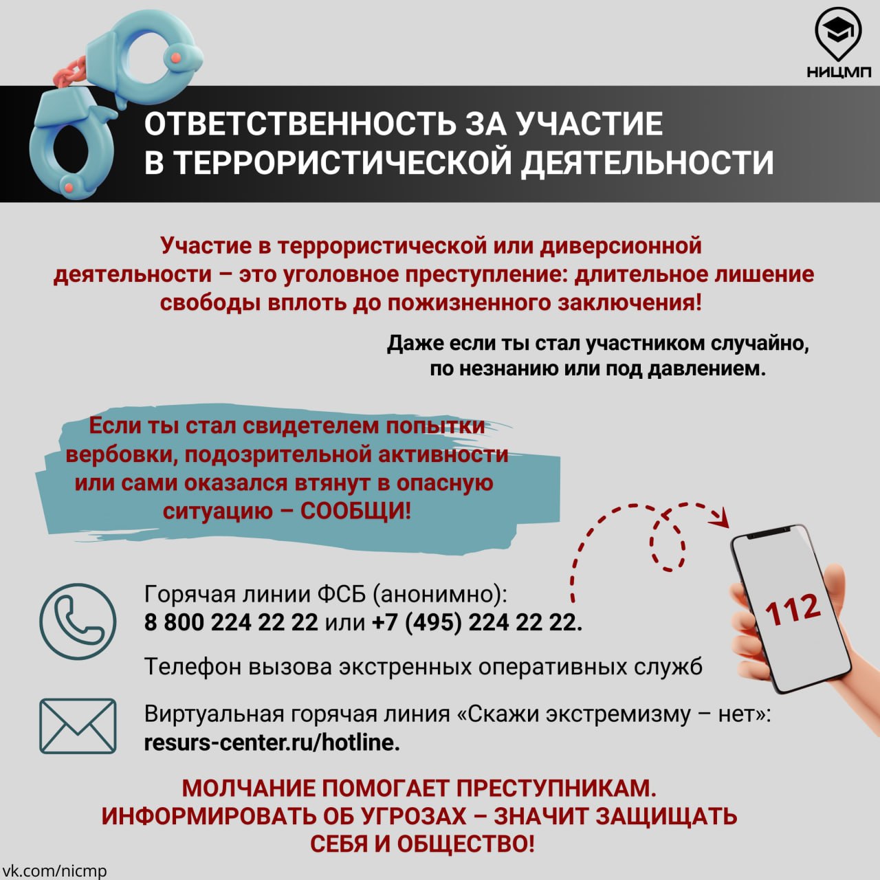 НИЦ Мониторинга и профилактики напоминает: участие в террористической или диверсионной деятельности — это уголовное преступление!