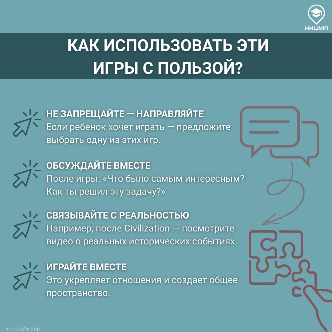 В карточках НИЦ Мониторинга и профилактики приведены примеры видеоигр, которые при ответственном подходе могут стать частью полезного и развивающего досуга.