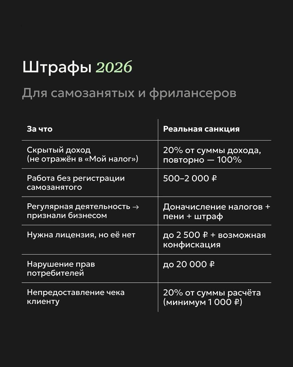 В 2026 году контроль стал жёстче, а штрафы — ощутимее. Собрали основные для бизнеса, для водителей, для мужчин и для самозанятых и фрилансеров.