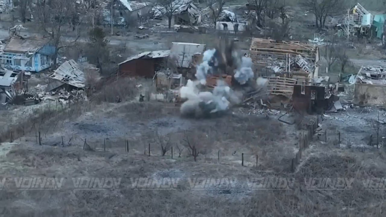 Заброс ТМ-62 в здание с украинскими солдатами на окраине Гуляйполя. Подрыв происходит буквально в упор от российского штурмовика, стоящего через стену от здания, однако заявляется, что боец выжил. @voin_dv
