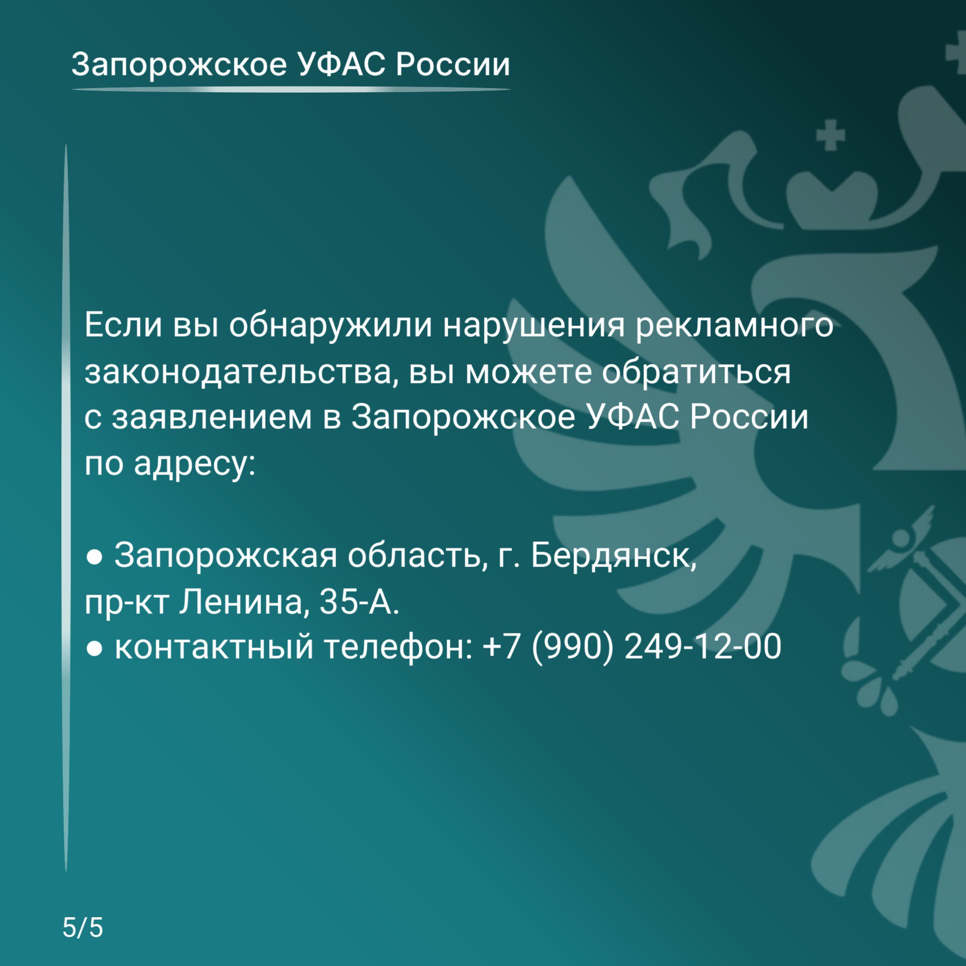 Если вы обнаружили нарушения рекламного законодательства, вы можете обратиться с заявлением в Запорожское УФАС России по адресу: Запорожская область, г. Бердянск, пр-т Ленина, 35-А.