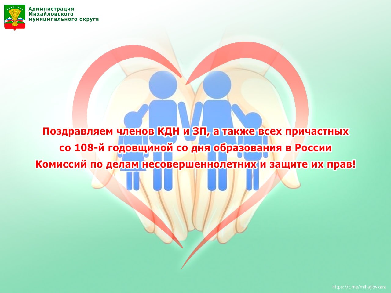 Уважаемые члены Комиссии по делам несовершеннолетних и защите их прав Михайловского муниципального округа и все причастные к этой важнейшей работе! От имени Администрации Михайловского муниципального округа сердечно поздравляем вас со знаменательной датой – 108-й годовщиной со дня образования в России Комиссий по делам несовершеннолетних и защите их прав!