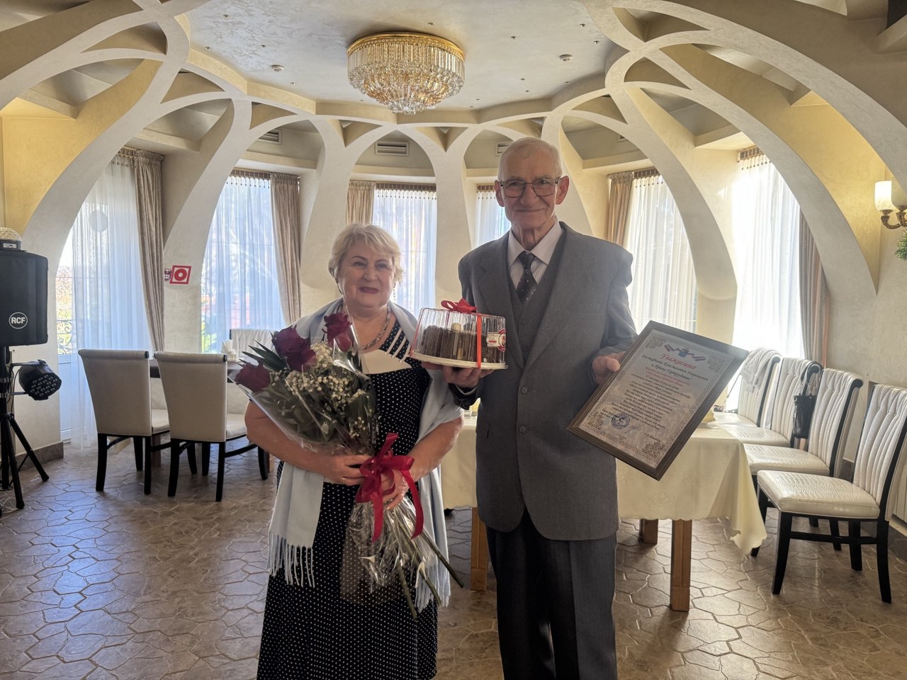 "Уважаемые Константин Георгиевич и Ирина Гертрудовна! Примите наши искренние поздравления в день вашего свадебного юбилея. Вы уже 50 лет рука об руку идёте по супружескому пути, преодолевая невзгоды и радуясь общим успехам. Ваш союз воплощает идеалы семейной жизни: взаимную любовь, уважение, доверие и преданность.Все эти годы ваша сердечность согревает близких вам людей, наполняя дом теплом и нежностью. Мир вашему дому и низкий поклон за великий труд быть единой семьей. Желаем вам крепкого здоровья, долгих лет жизни, непрестанной поддержки и заботы родных!"