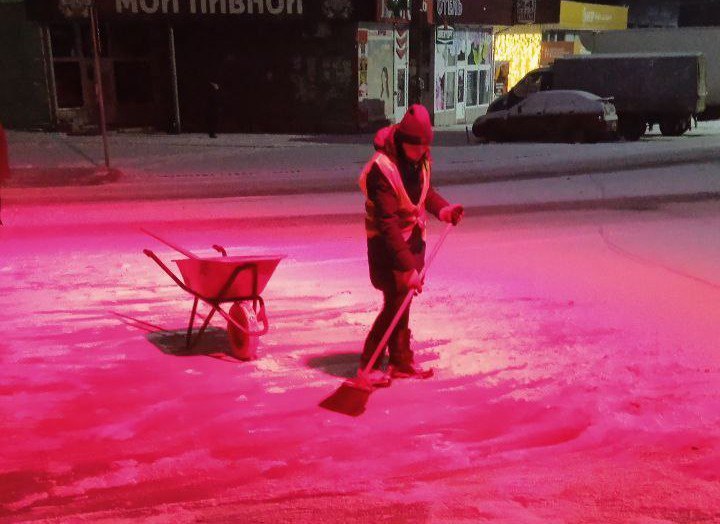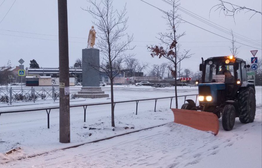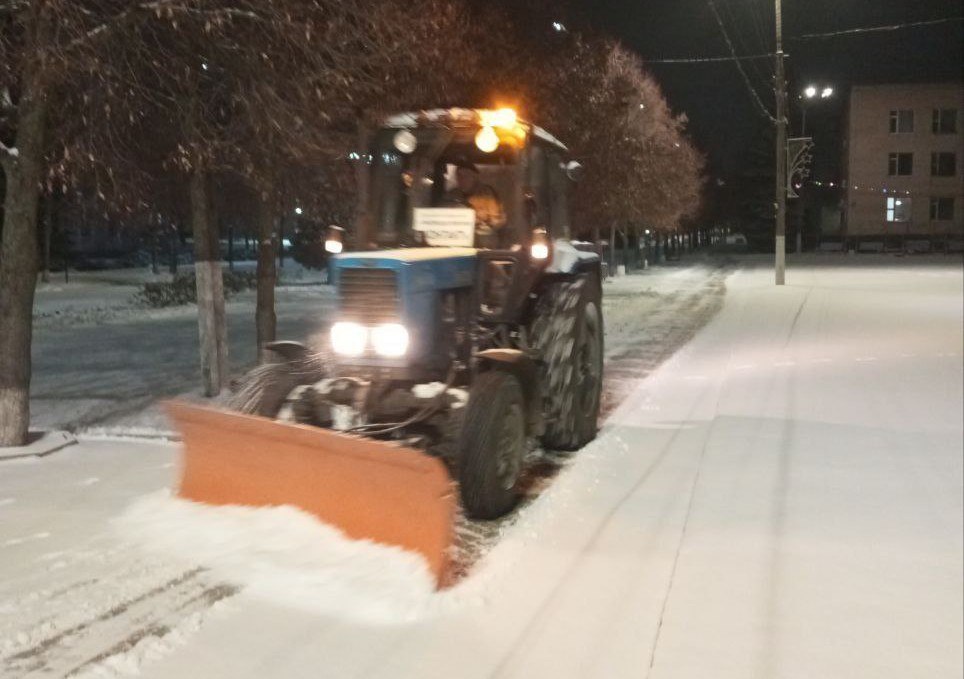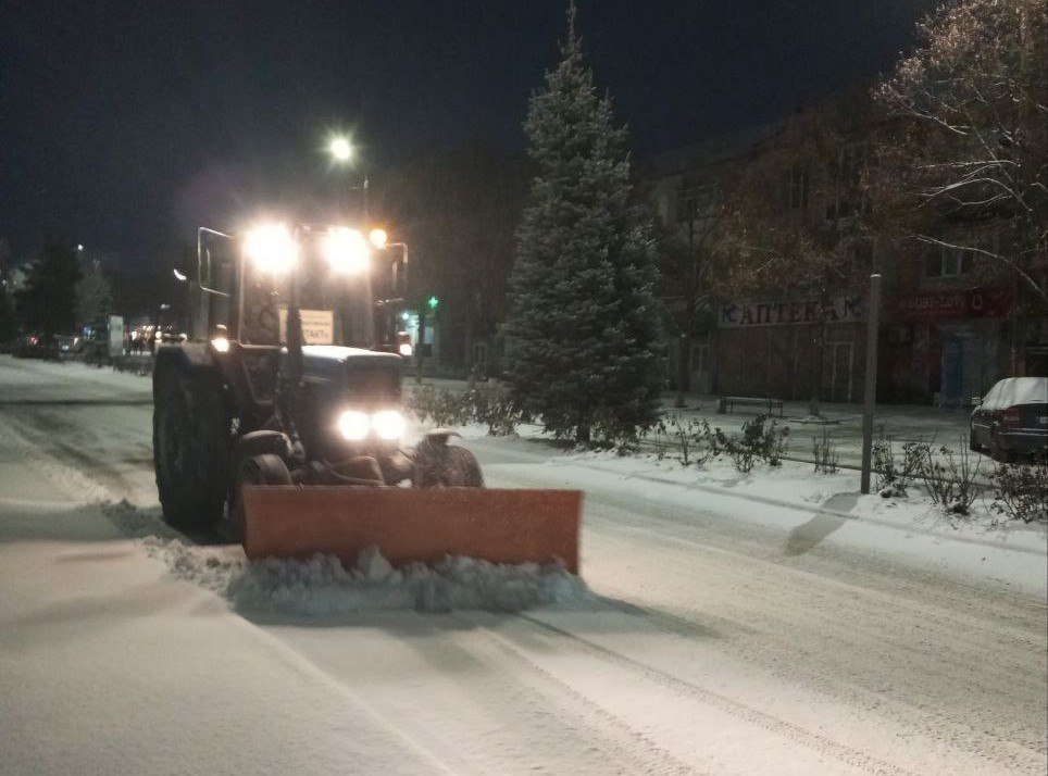Техника и сотрудники МУП УК «Контакт» с раннего утра расчищают улицы Токмака от снега