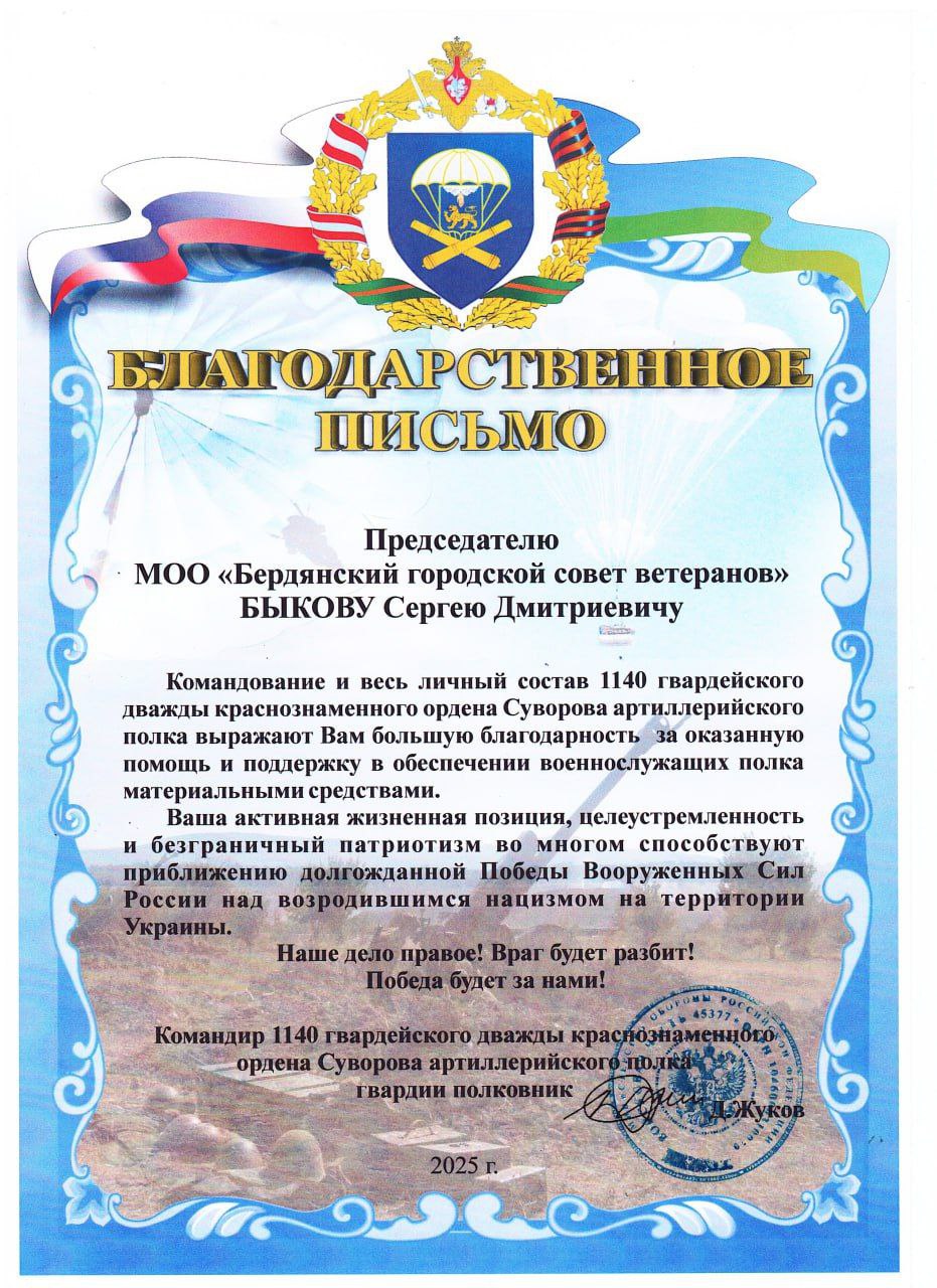 — председателю Бердянского городского совета ветеранов Быкову Сергею Дмитриевичу;