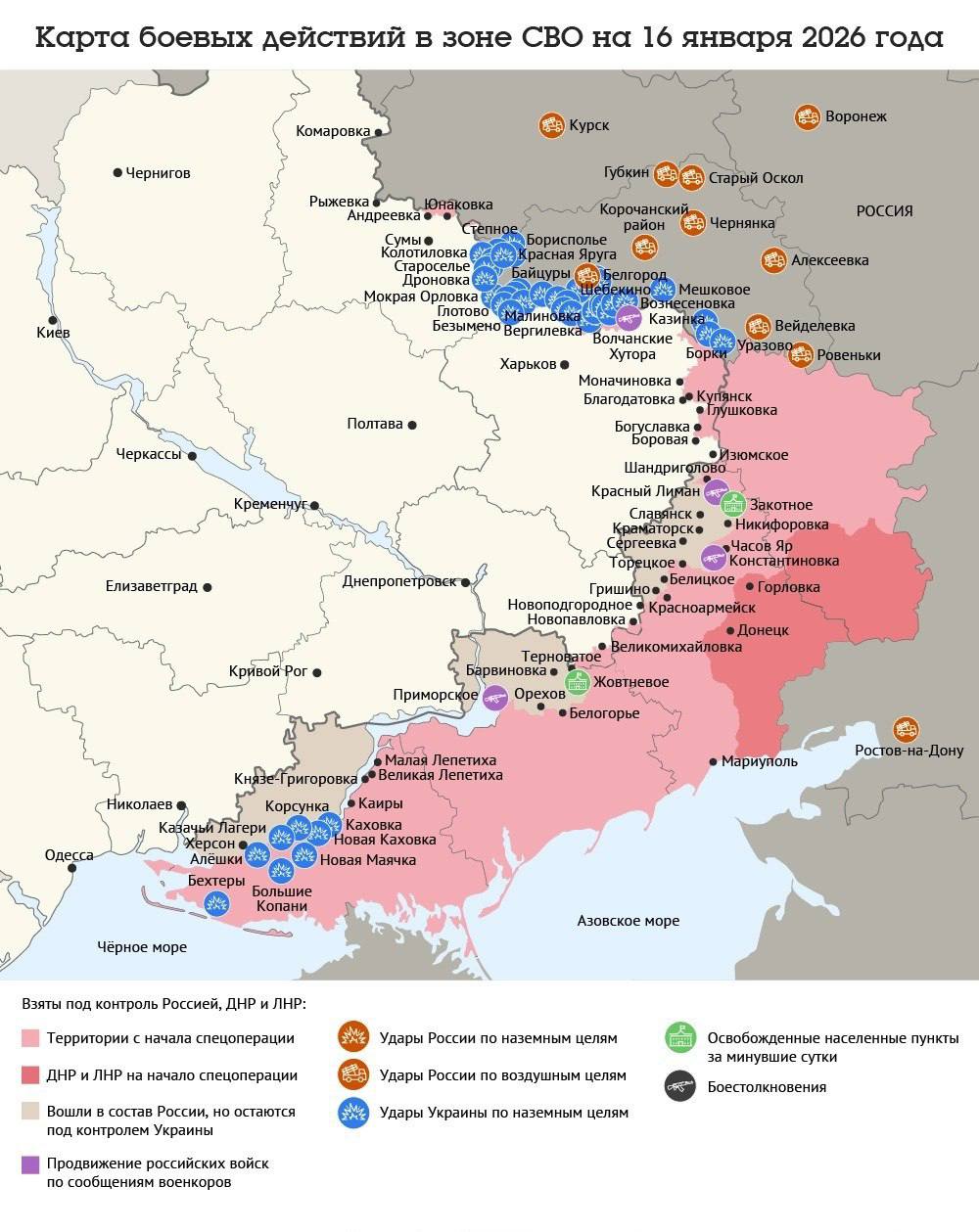 По данным Минобороны, 16 января 2026 года ВС РФ освободили села Закотное в ДНР и Жовтневое в Запорожской области. Также военкоры сообщают, что врага практически выбили из запорожского села Приморское, но официально эта информация пока не подтверждена.