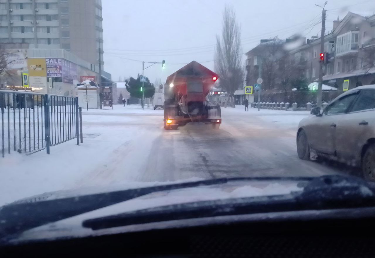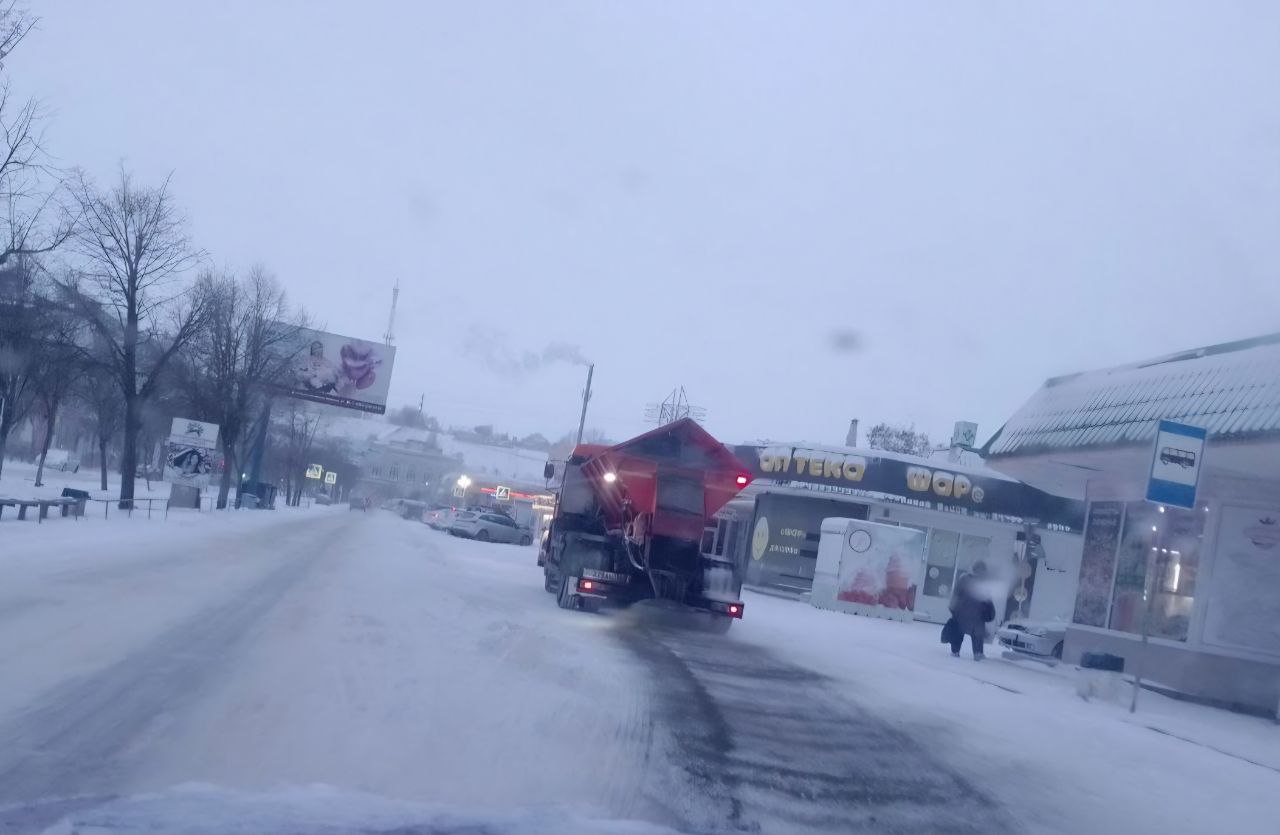 Утро 17 января 2026 года. Сотрудники МБУ "Благоустройство. Бердянск" продолжают расчистку дорог и тротуаров города от снега и выполняют посыпку противогололедной смесью.