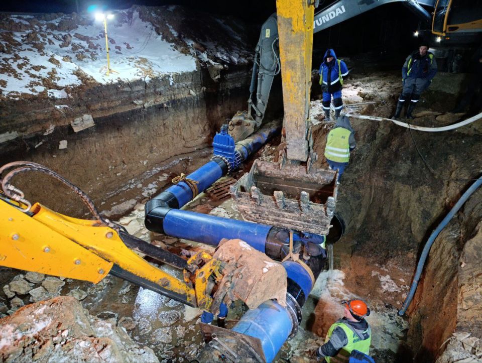 Ночью, в мороз работы по переврезке нового участка водовода "Прилив" продолжаются