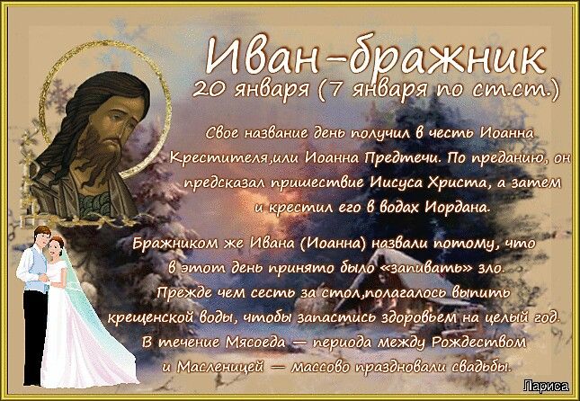 20 января - отмечается Иванов день или Иван Бражник. В церковном православном календаре это день Собора святого Пророка, Предтечи и Крестителя Господня Иоанна.