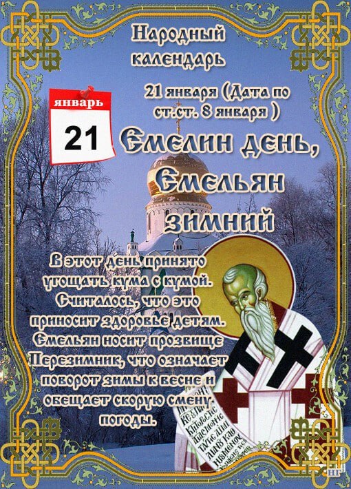 21 января - Емельянов день, Емельян Зимний, Емельян Кумишный. Праздник приурочен к церковной памяти святителя Емилиана Кизического.