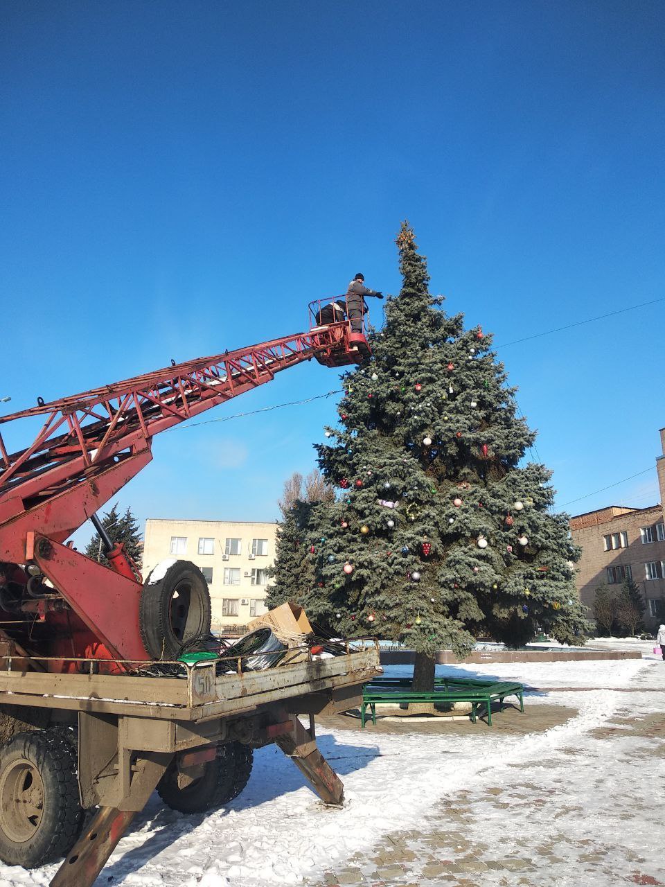 На городской площади коммунальщики смотали электрогирлянды, сняли с елки и бережно упаковали огромные игрушки, отправив их на склад до декабря.