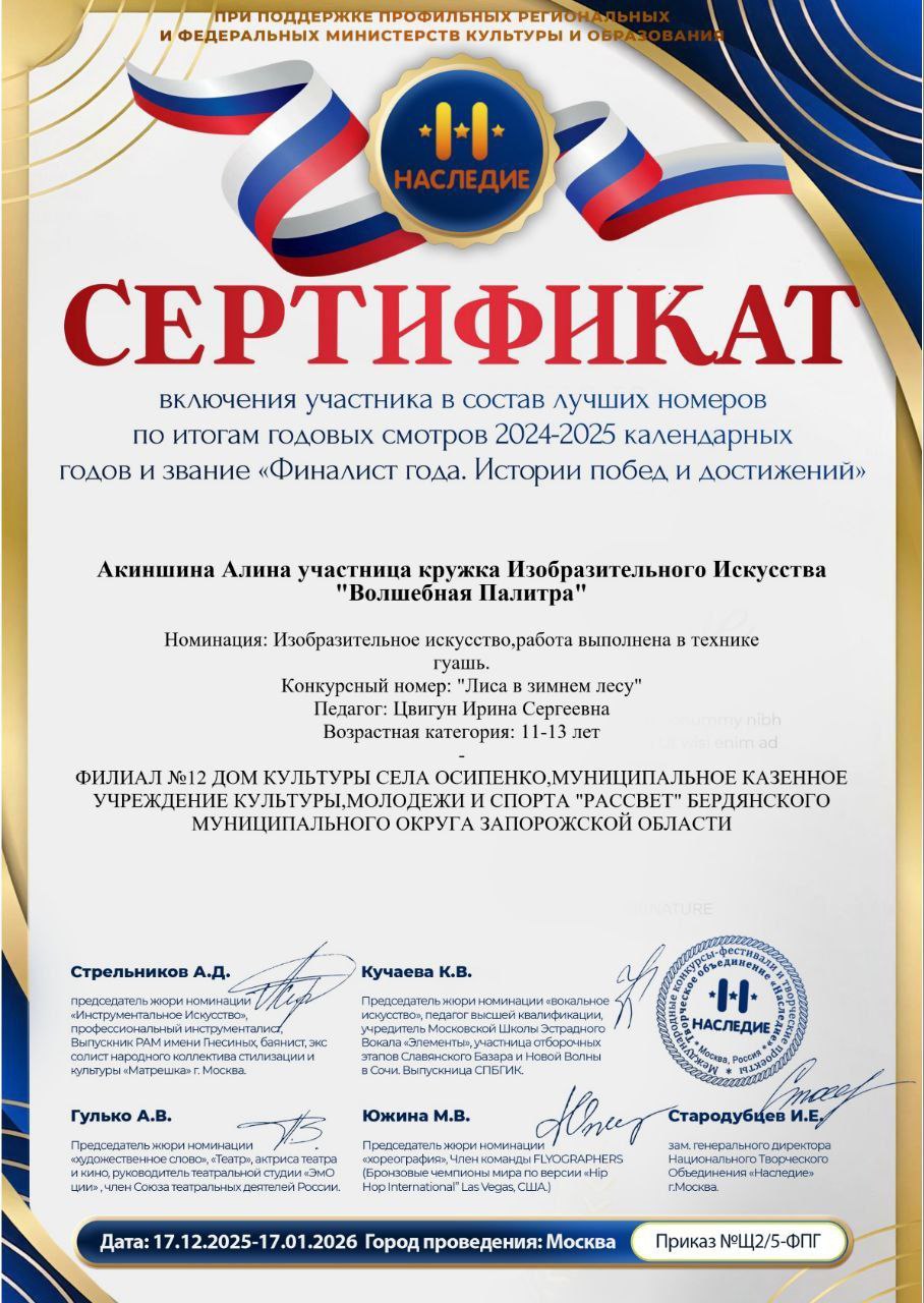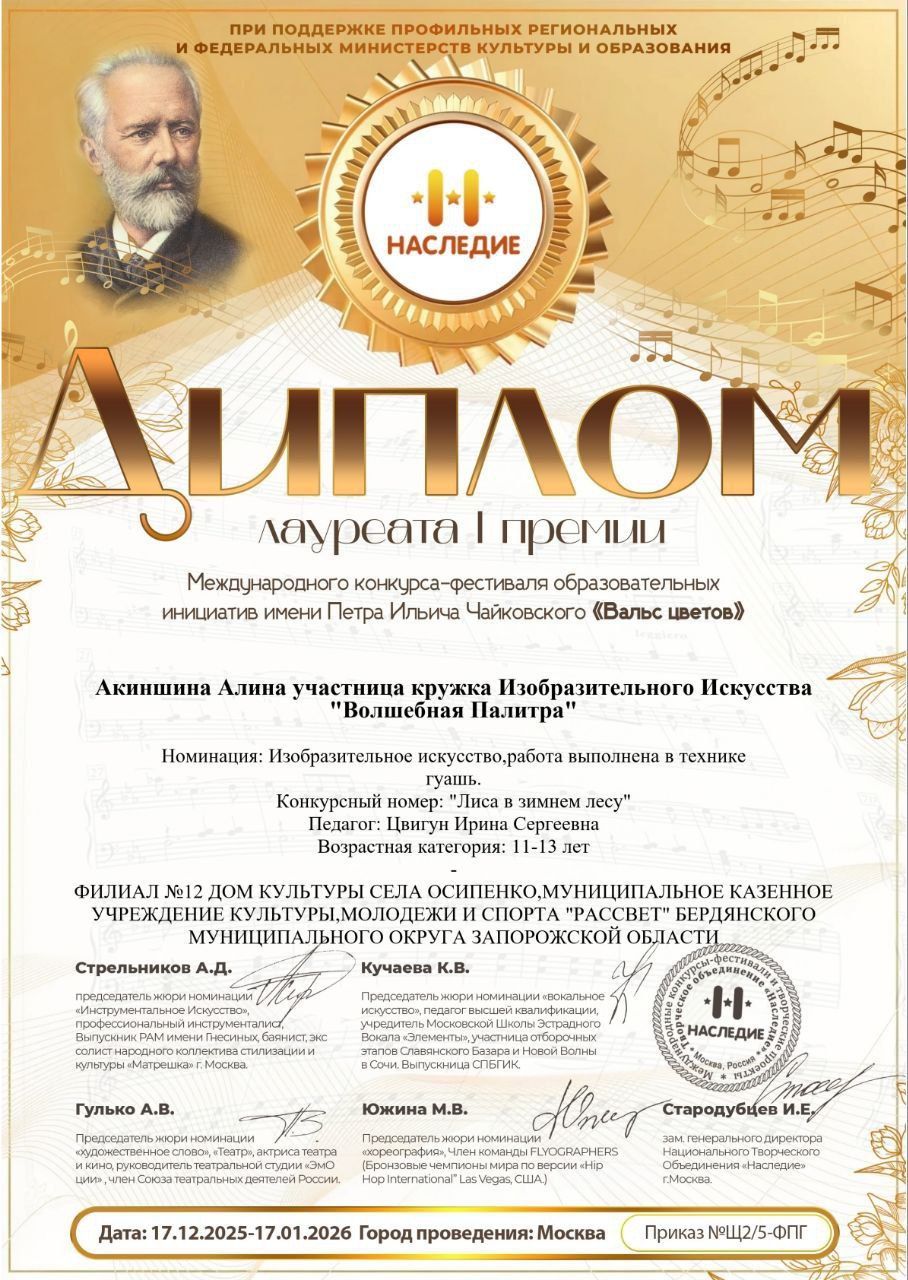 Воспитанницы кружка «Волшебная палитра» филиала № 12 Дома культуры села Осипенко — Алина Акиншина и Виктория Клепчева — добились успехов на международной арене. На конкурсефестивале «Щелкунчик» девочки стали лауреатами 1й степени, продемонстрировав высокий уровень художественного мастерства. Заслуженной оценкой их таланта стало и благодарственное письмо, которое получила руководитель кружка Ирина Сергеевна Цвигун от организаторов фестиваля.