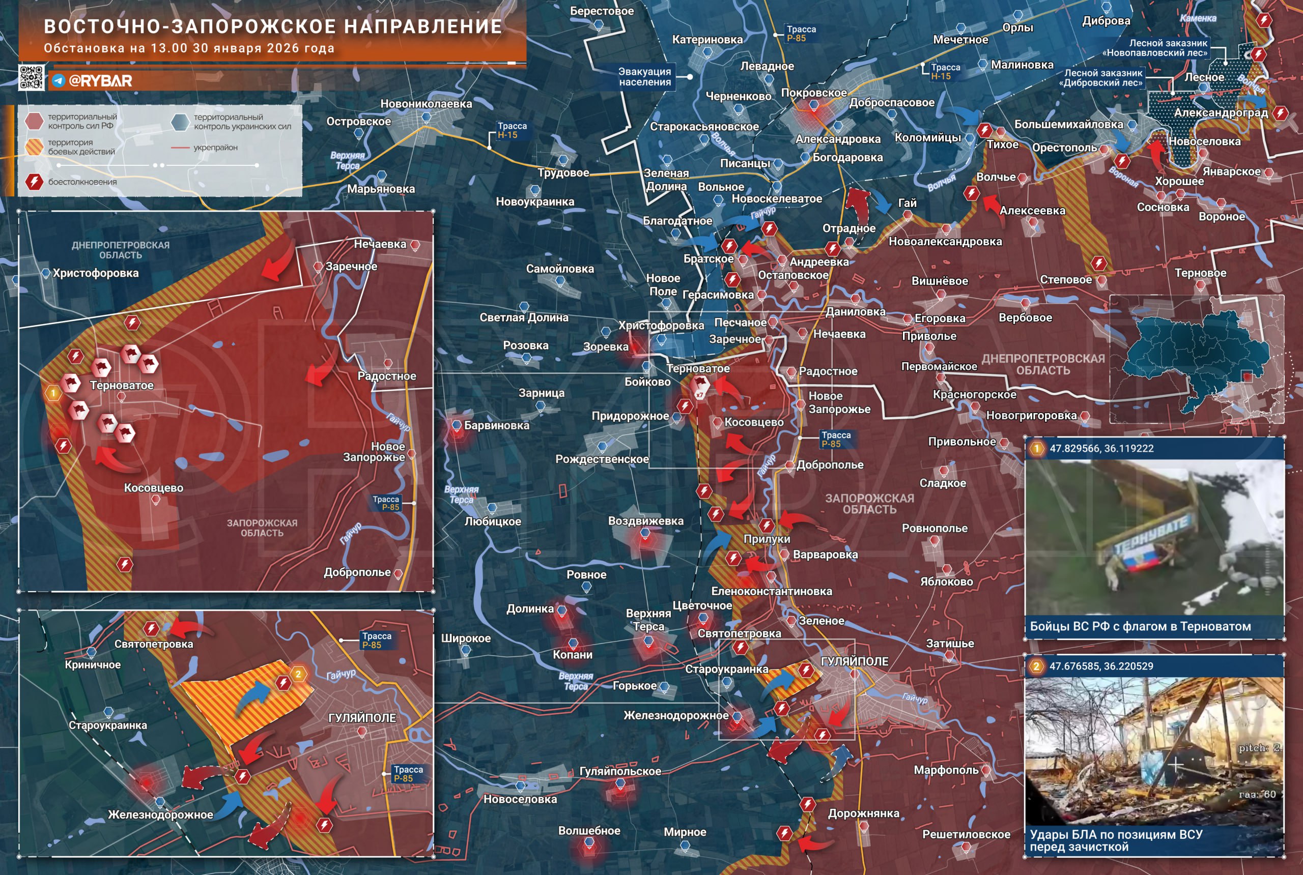На Восточно-Запорожском направлении подразделения группировки войск «Восток» продолжают расширять плацдарм на левом берегу Гайчура. Поступили кадры, подтверждающие контроль ВС РФ над Терноватым, бои в окрестностях которого шли последний месяц.