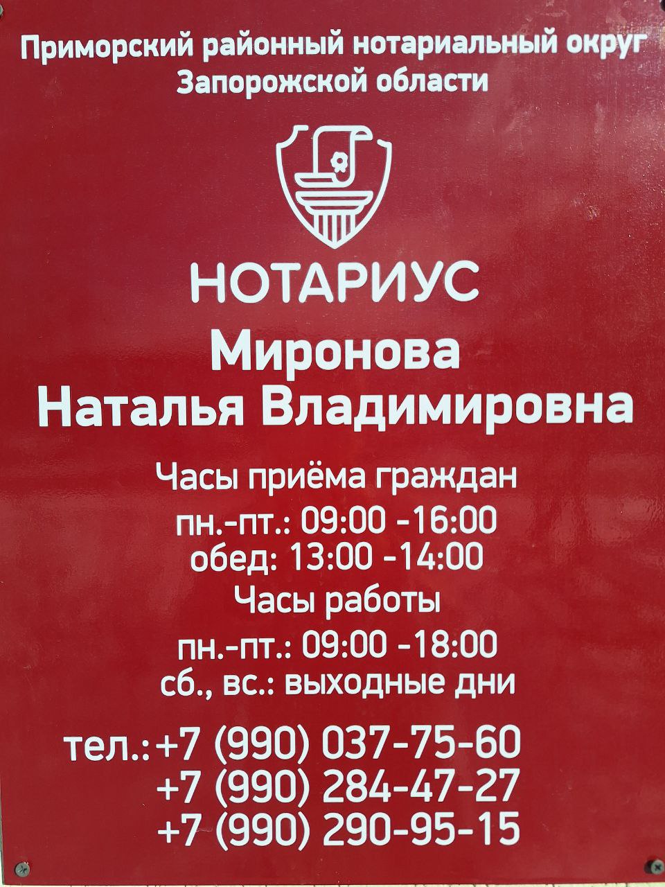 Нотариус Миронова Наталья Владимировна, которая ранее принимала по адресу: г. Приморск, ул. Банковская, д. 113 (возле магазина «МЕРА»), находится по новому адресу: город Приморск, улица Голубенко (Дружбы, Владлена Татарского), дом 12.