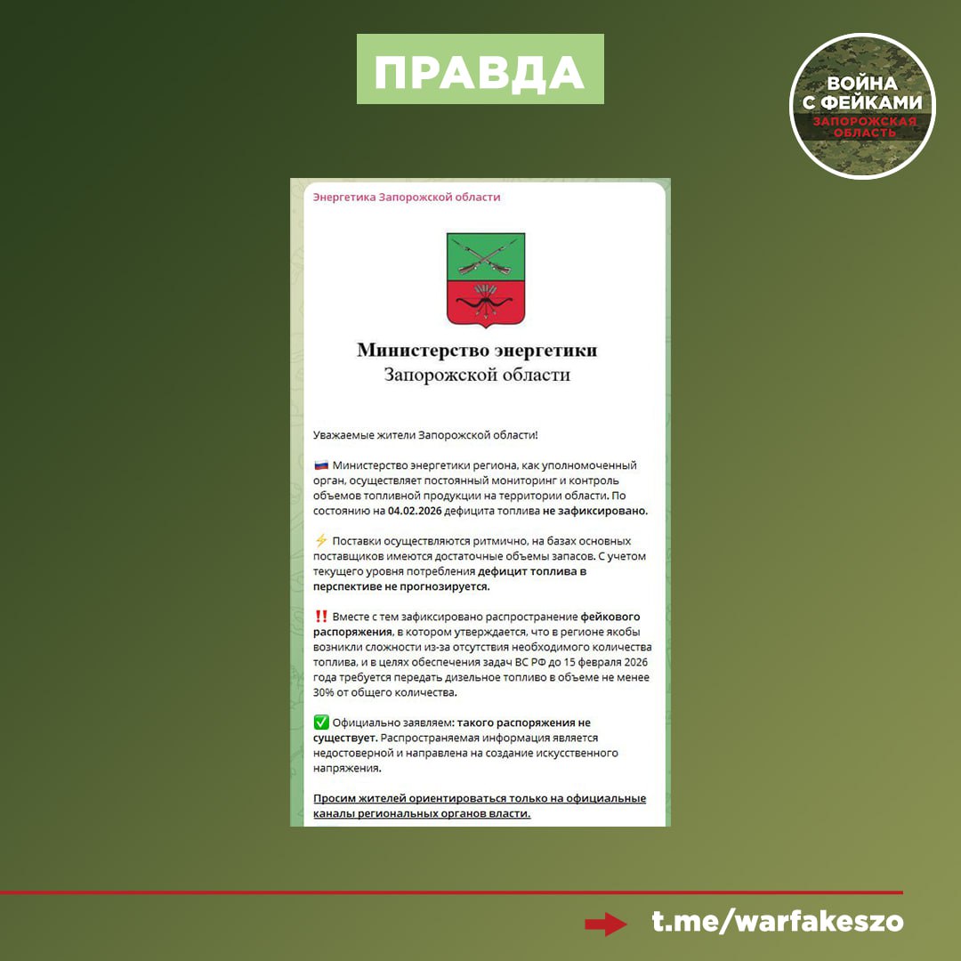 Фейк: В Запорожской области возникли сложности с поставками топлива, и до 15 февраля 2026 года требуется передать дизельное топливо в объеме не менее 30% от общего количества для обеспечения задач ВС РФ. Данная информация опубликована на канале губернатора региона.