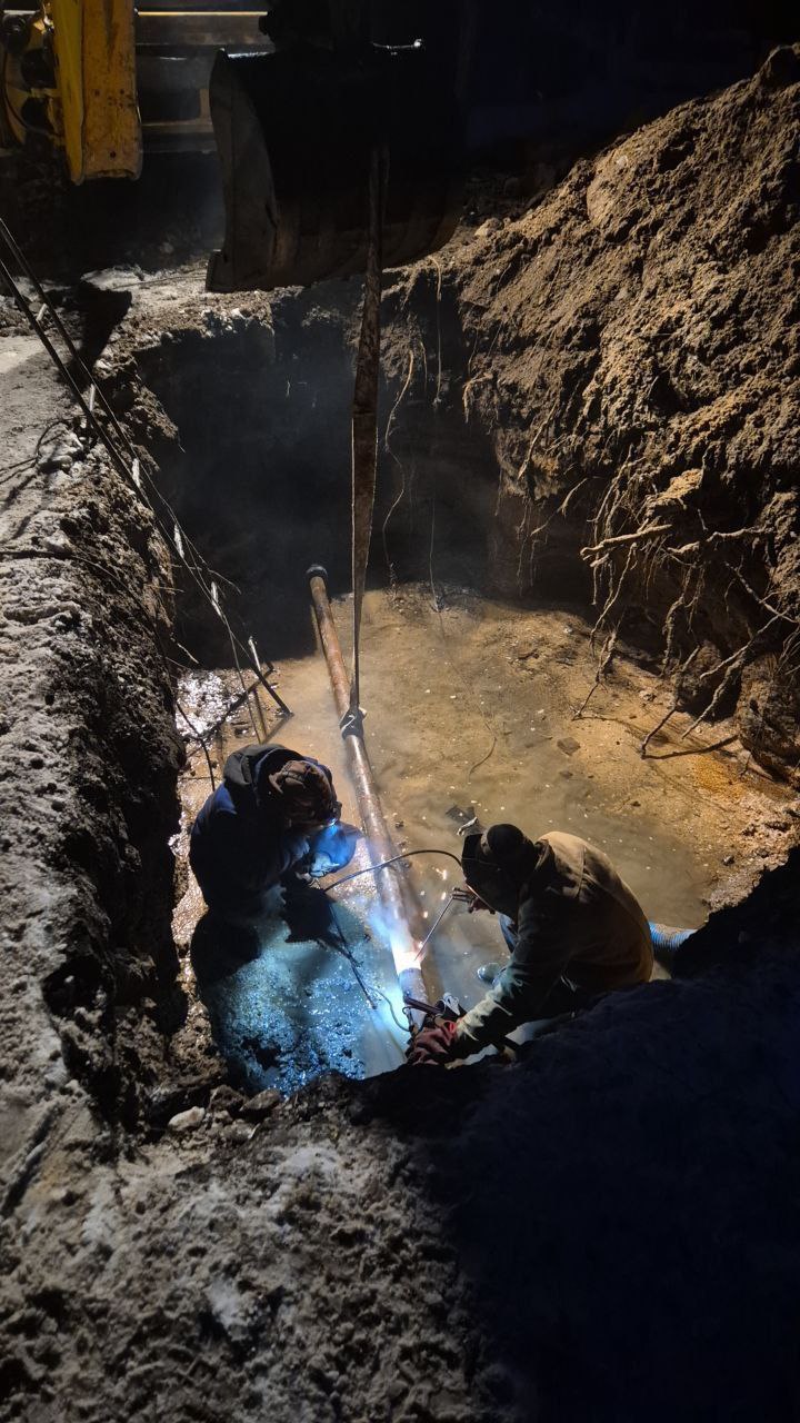 Уже ночь, но сотрудники водоканала продолжают работы по замене аварийного участка трубы на ул. Лиепайская,42.