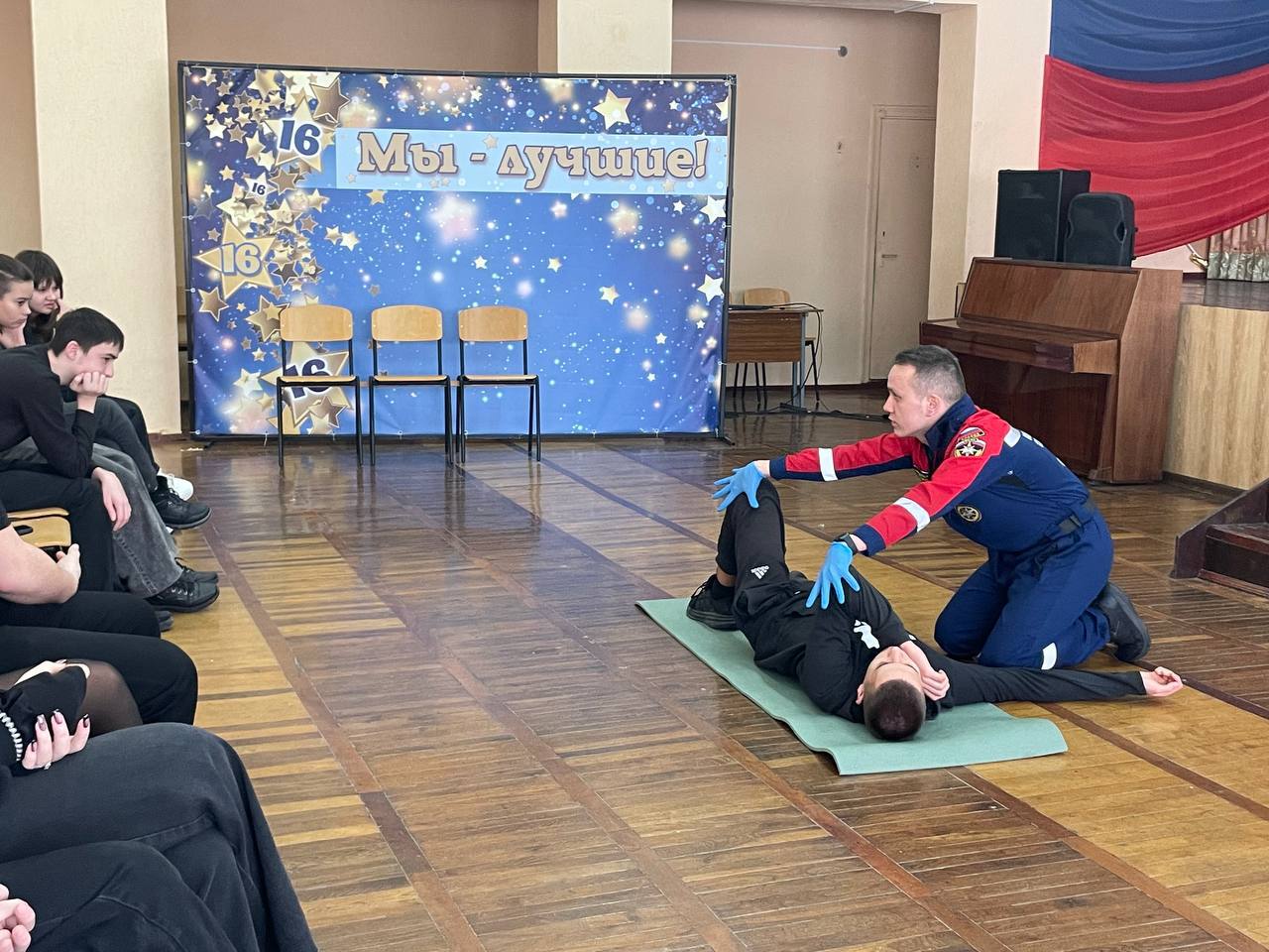Побывали в СОШ № 11, где вместе с юными спасателями ШСО «Авангард 11» отрабатывали навыки наложения шин и повязок. Также провели занятие в Бердянской СОШ № 16, обсудив алгоритм оказания первой помощи — от оценки состояния пострадавшего и вызова медиков до проведения сердечно-легочной реанимации