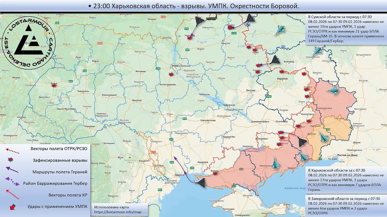 Анимированная схема ударов по территории Украины 08 февраля 2026 – 09 февраля 2026 года