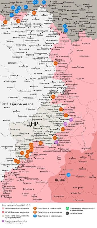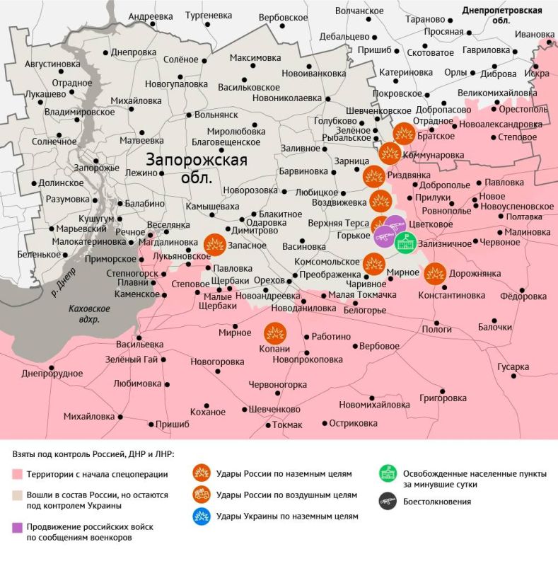По данным Минобороны, ВС РФ освободили в Запорожской области село Зализничное, продвигаясь к Орехову — последнему крупному пункту обороны ВСУ на этом направлении. Кроме того, наши войска с боями продвигаются в Константиновке.