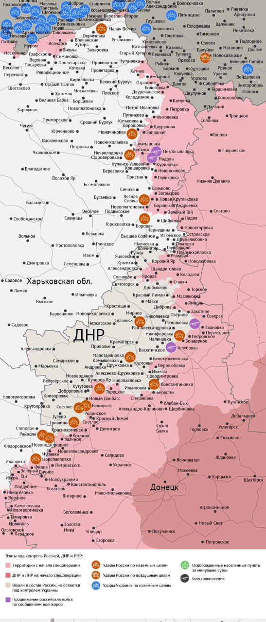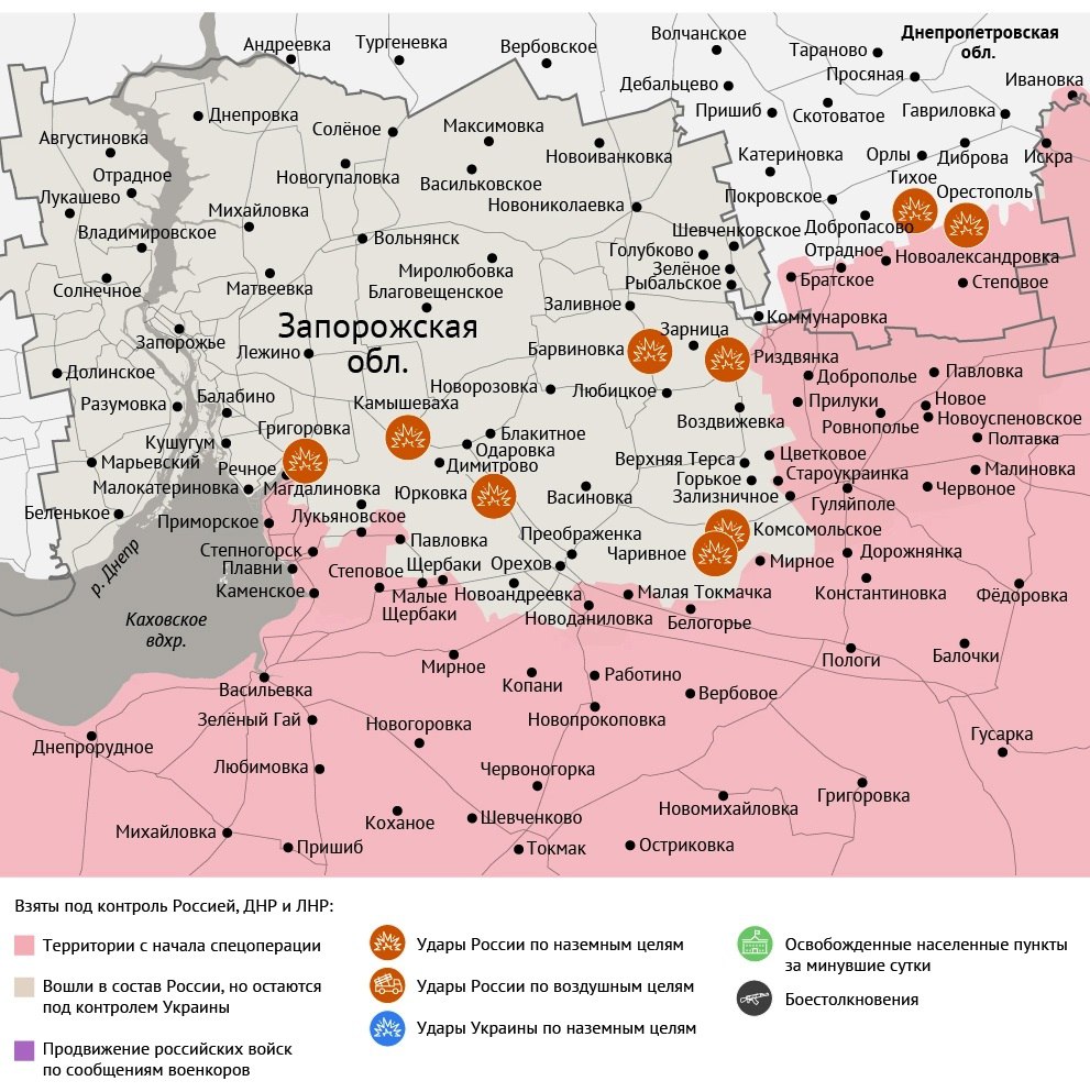 Военкоры сообщают, что ВС РФ ворвались в село Голубовка, развивая наступление на Славянск. Кроме наши бойцы рвутся к Орехову­ — последнему крупному укрепрайону ВСУ в Запорожской области.