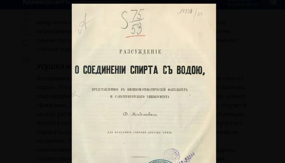 Менделеев защитил диссертацию «О соединении спирта с водою» (даже слова «водка» в ней нет)