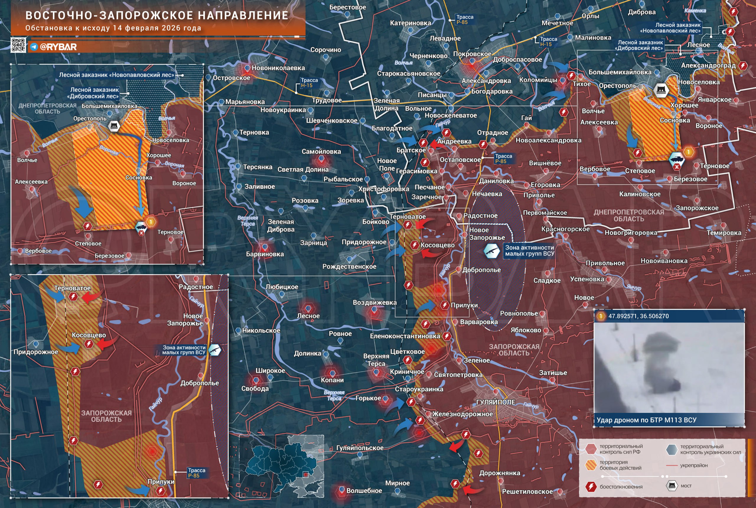 По меньшей мере одной из БТР М113 удалось прорваться до подступов к Березовому, где она была уничтожена дронами. Судя по всему, машина ехала с севера в обход Орестополя. В самом Орестополе, вероятнее всего, присутствие ВС РФ если и есть, то весьма ограниченное.