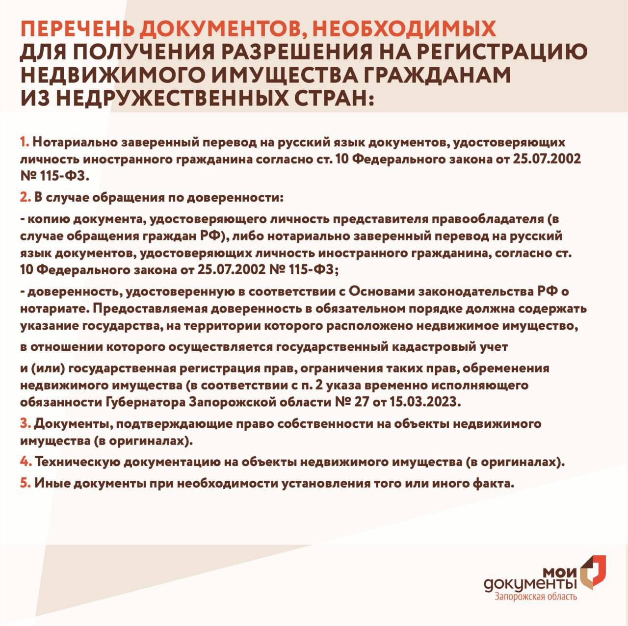 Перечень документов, необходимых для получения специального разрешения на регистрацию недвижимого имущества, расположенного на территории Запорожской области, гражданам из недружественных стран, указан на картинке к посту.