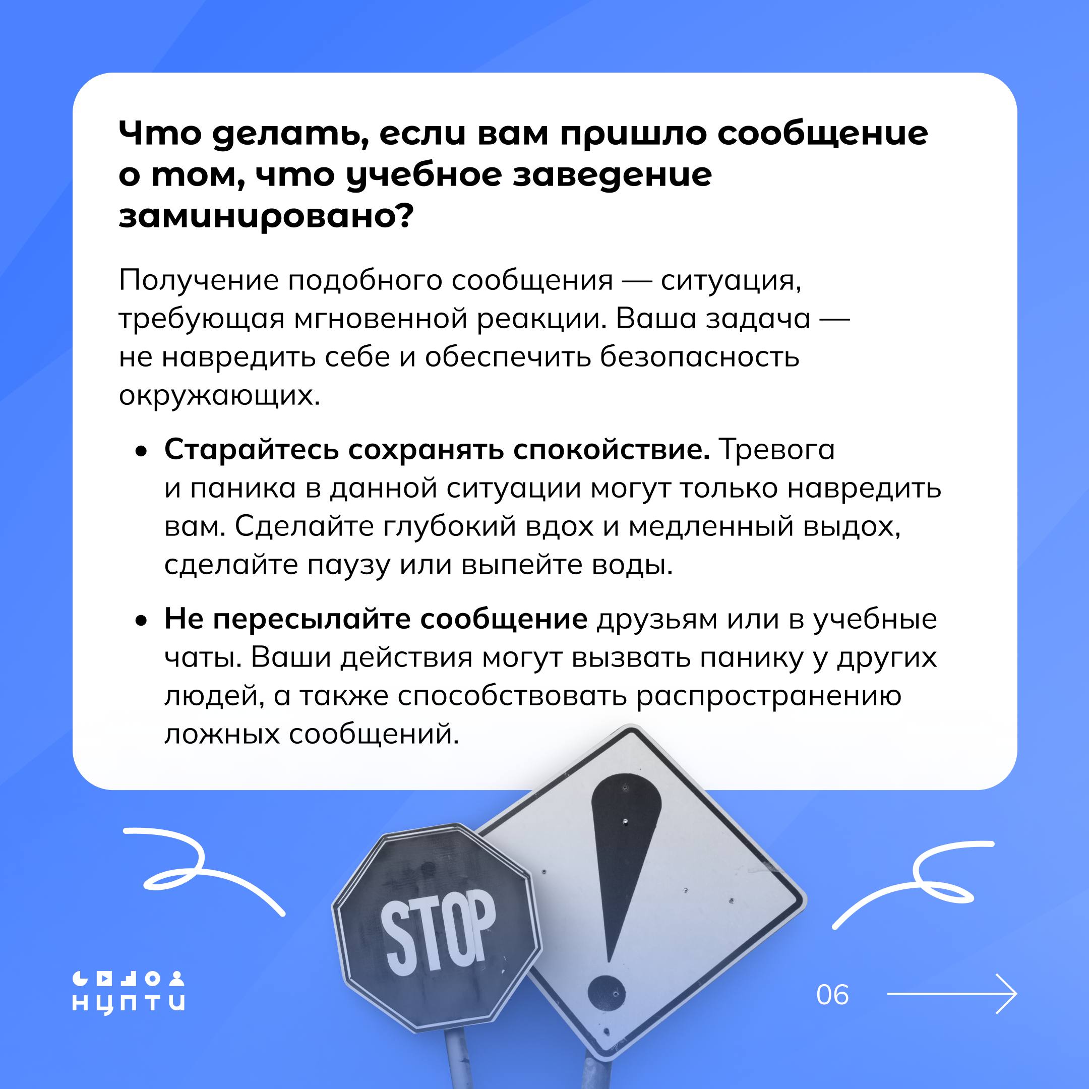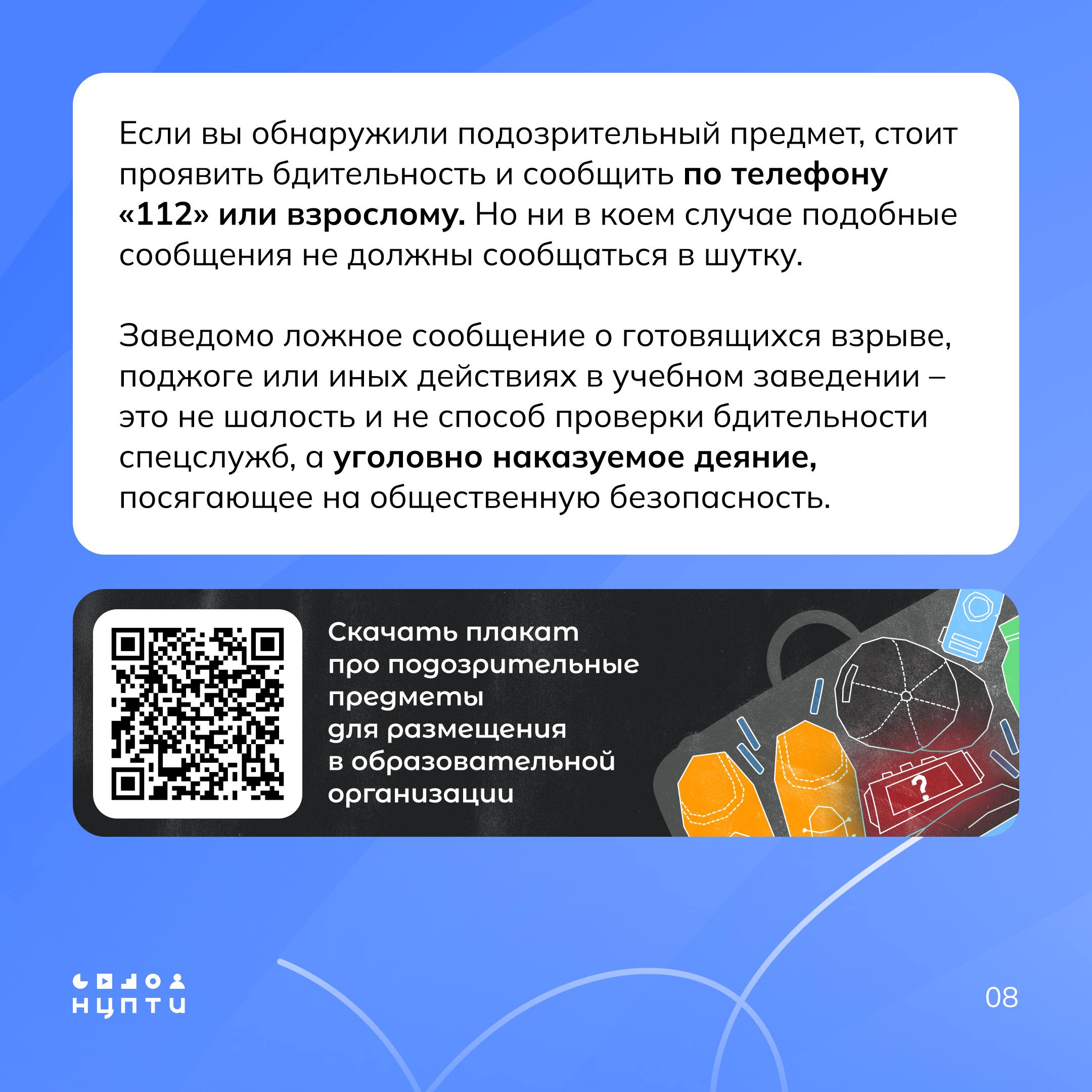 Воспринимаемое многими как «невинное баловство», заведомо ложное сообщение о минировании учебного заведения является серьезным преступлением. Какая ответственность ждет тех, кто распространяет ложные сообщения? Что делать, если вам прислали сообщения о минировании учебного заведения? Разберем в карточках