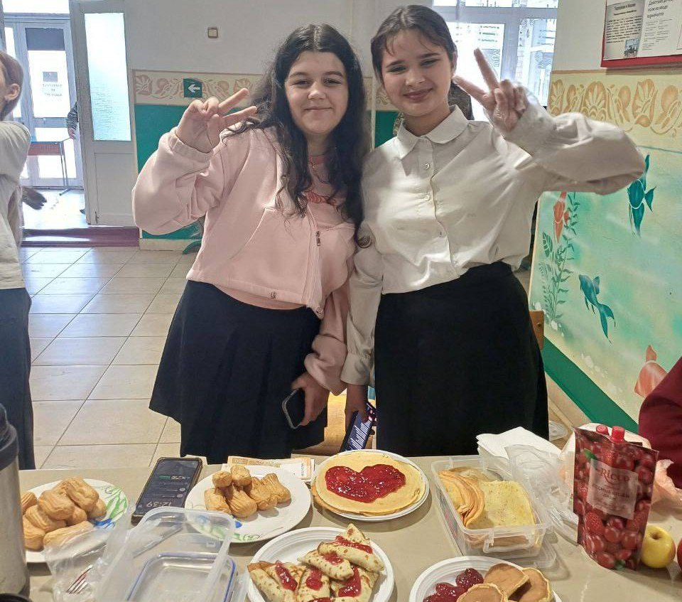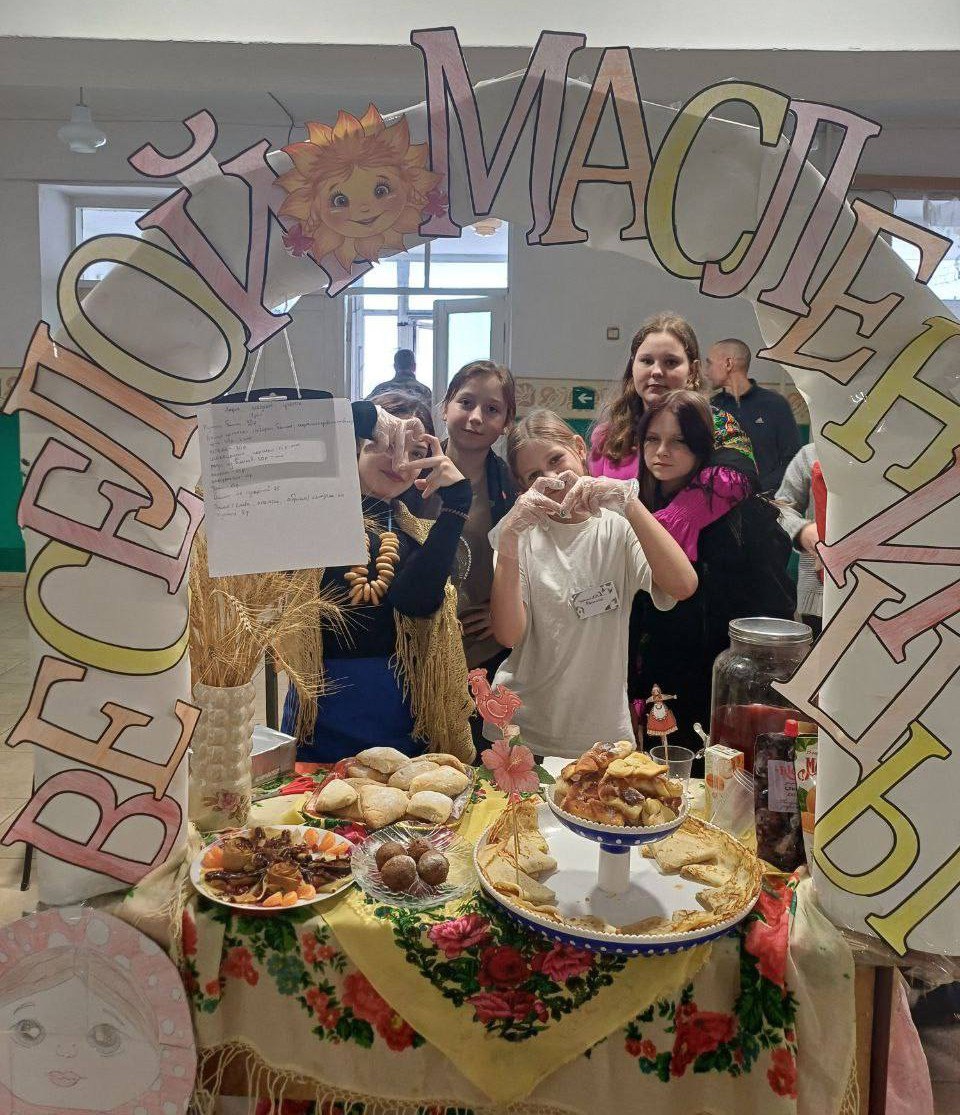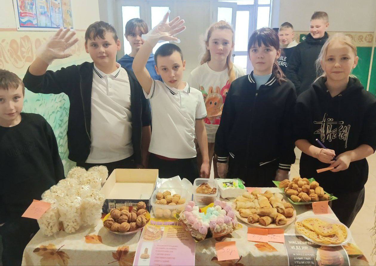 Сельская школа Токмакского муниципального округа превратилась в настоящую праздничную ярмарку: тут и блинчики с разнообразными начинками и вареньем, и поделки ручной работы, и море улыбок!