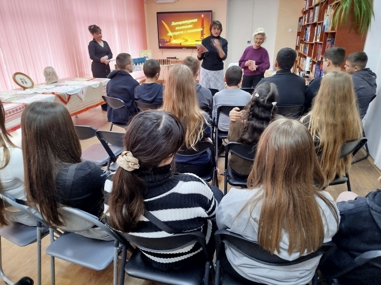Автор удивила ребят не только своими стихами, но и невероятными работами — авторскими вышивками.