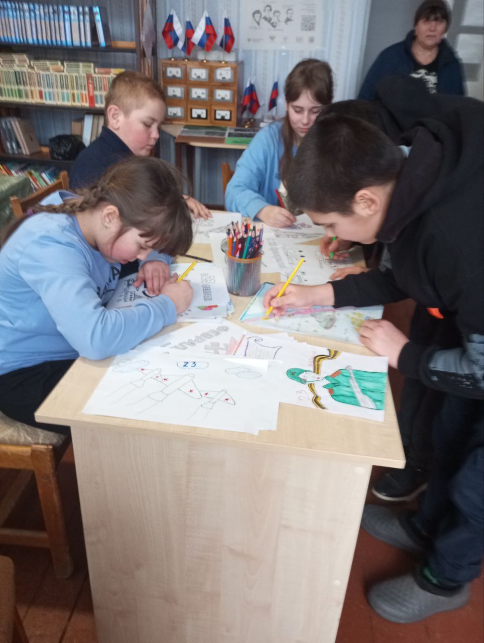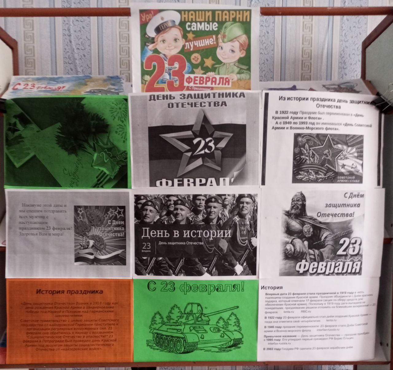 В библиотеке села Николаевка в честь праздника прошёл час общения с выставкой детских рисунков «Аты-баты, шли солдаты». Юные художники через творчество выразили своё отношение к воинской доблести и преемственности поколений. Экспозиция служит для сохранения исторической памяти и формирования уважения к защитникам Родины.