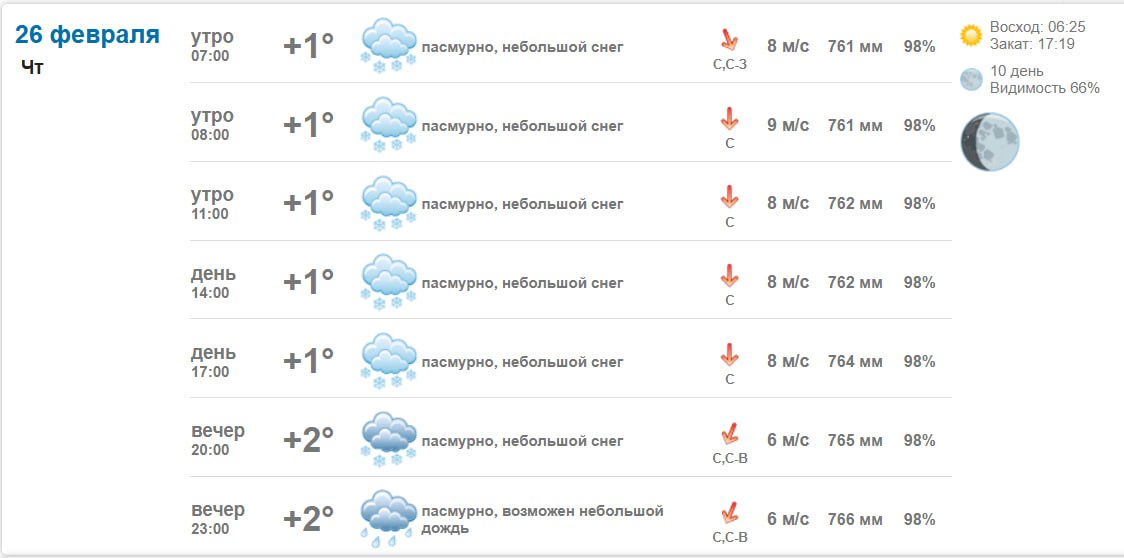 Сегодня, 26 февраля 2026 года в Васильевке пасмурно, небольшой снег. Температура воздуха ... +1°С. Ветер: умеренный, северный до 13 м/с. Атмосферное давление: 759 мм.рт.ст. Влажность воздуха: 98%. УФ-индекс: 0 (низкий). Видимость на дорогах: 0 км.