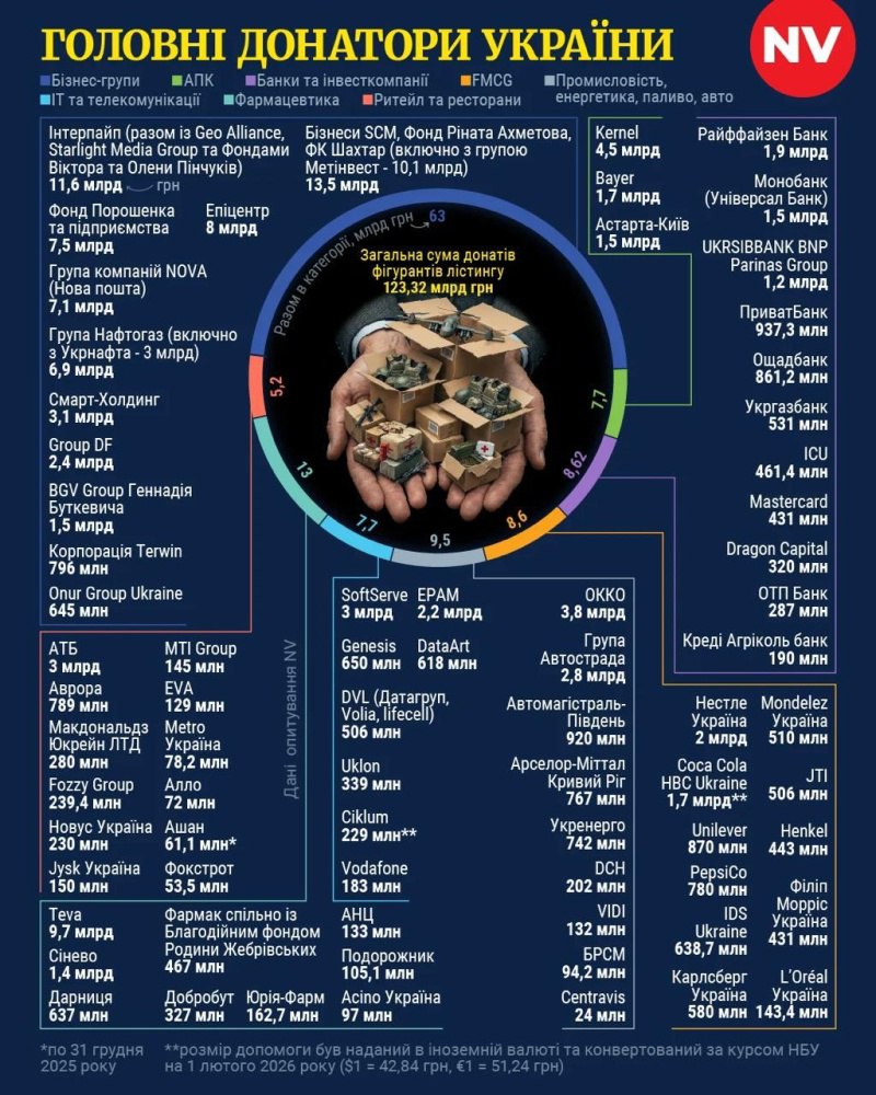 Украинское издание NV опубликовало сводный рейтинг корпоративной помощи Украине за время СВО. Более 70 украинских и зарубежных компаний задекларировали поддержку ВСУ и населения на сумму свыше 120 млрд грн. (213,6 млрд).