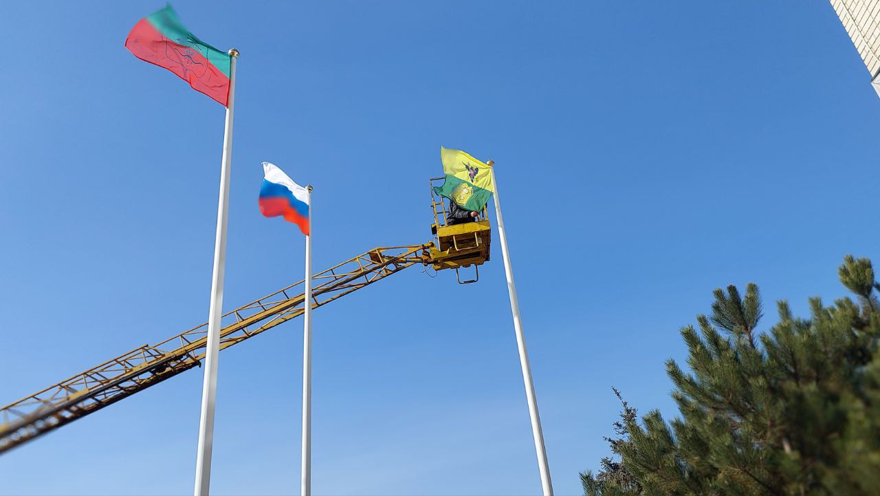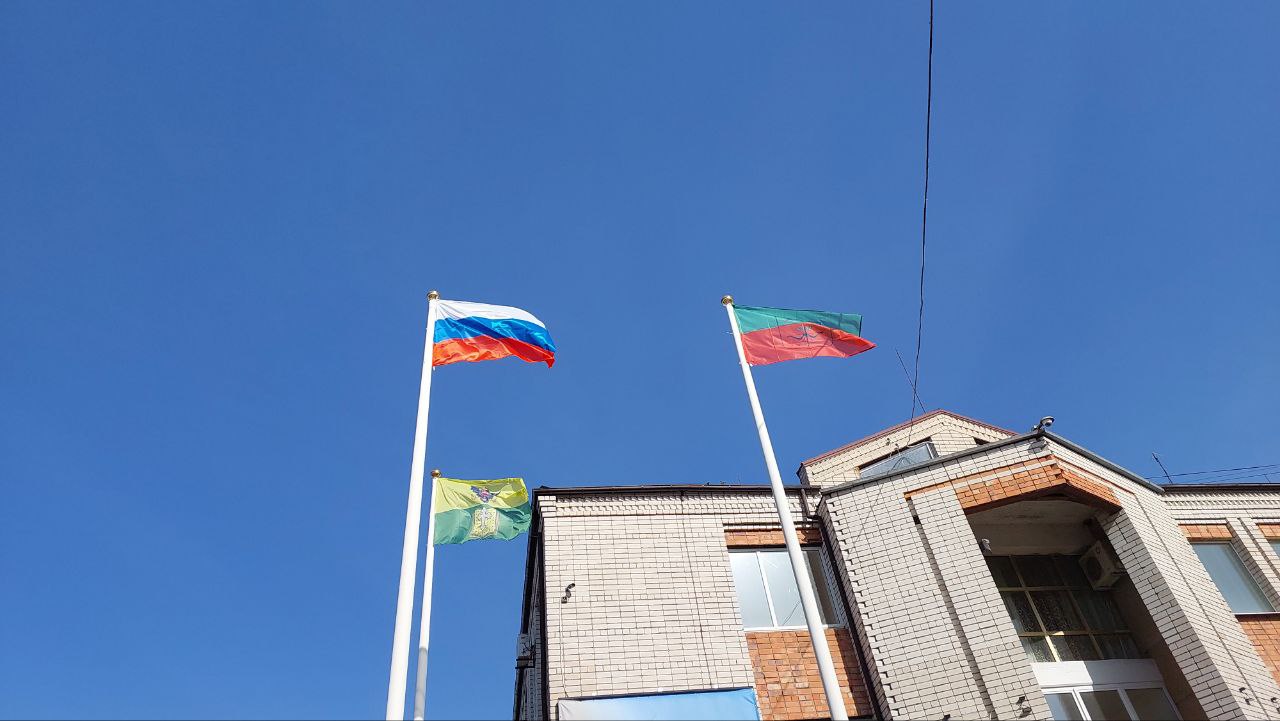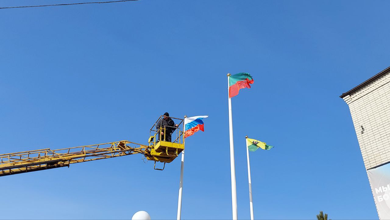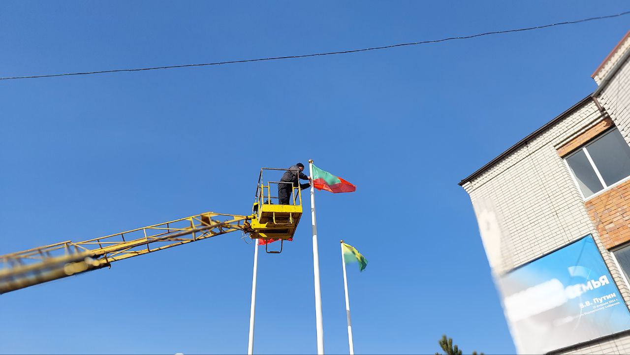 Работники МКУ "Благоустройство" Кирилловского участка городского округа Мелитополь на главных флагштоках в центре Кирилловки произвели замену потрёпанных уличной средой полотнищ флагов на новые.